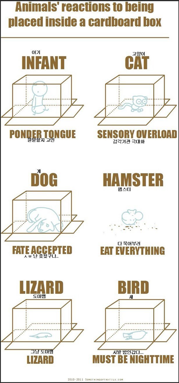 동물들이 다양한 반응을 보이는다. 아기를 상자 안에 넣으면 감각이 흥분되고, 고양이는 무언가를 생각하며 혀를 내두르고, 강아지는 운명을 받아들이며, 햄스터는 모든 것을 먹으며, 도마뱀은 그저 도마뱀 그 자체이다. 새는 밤일 것이라고 생각하고, 지식있는 답변을 찾아보면서 시간을 보내는 사람들도 있다.하지만 가끔 사람들의 태도는 마치 엉덩이 내포 같다.