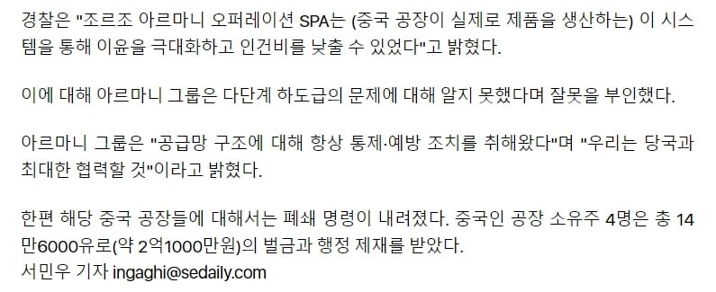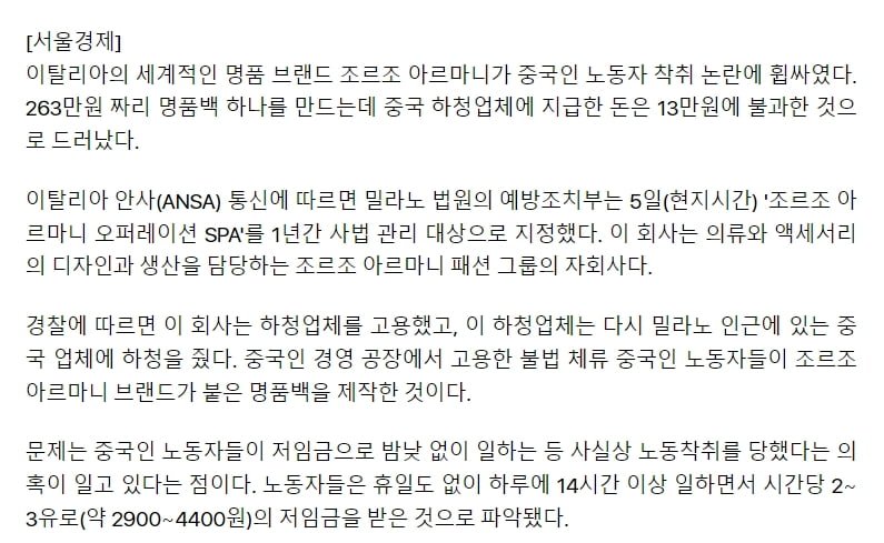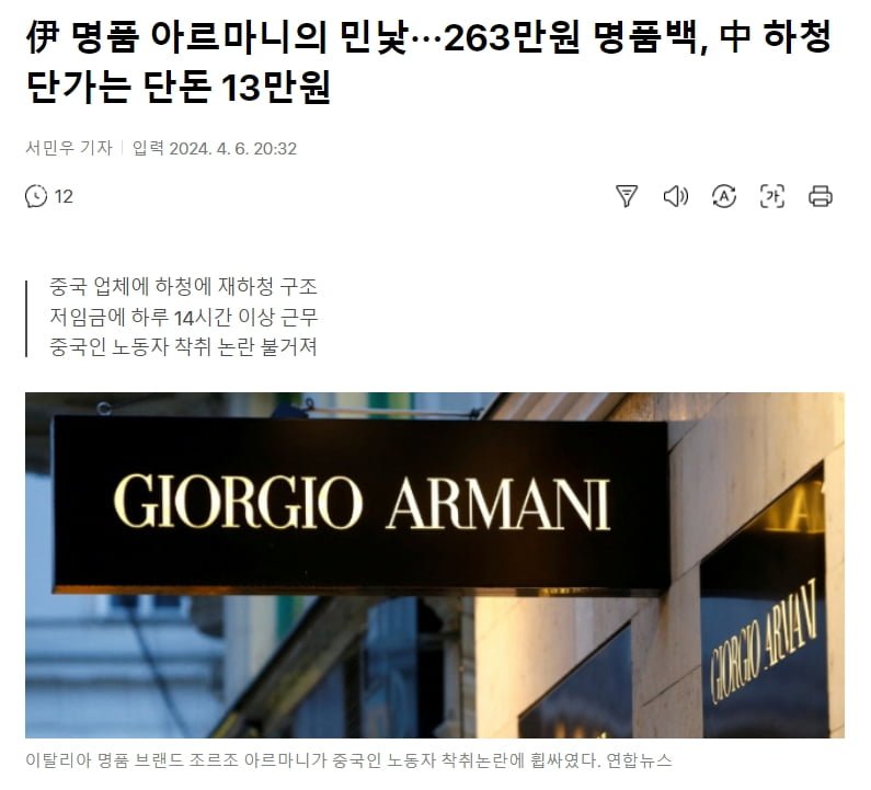 한 중국인 업체가 중간에서 수수료를 챙겨 삼중 하청 구조로 인한 낮은 단가가 문제로 대두되고 있다. 이에 대해 중국인 노동자들이 근로시간 단축과 적정한 임금을 요구하는 시위를 벌이고 있으며, 조르조 아르마니는 이 사안에 대해 적극적으로 조치를 취할 것이라고 밝혔다. 이번 사건을 계기로 명품 브랜드의 생산 과정과 노동자들의 권익 보호에 대한 관심이 높아질 것으로 예상된다.