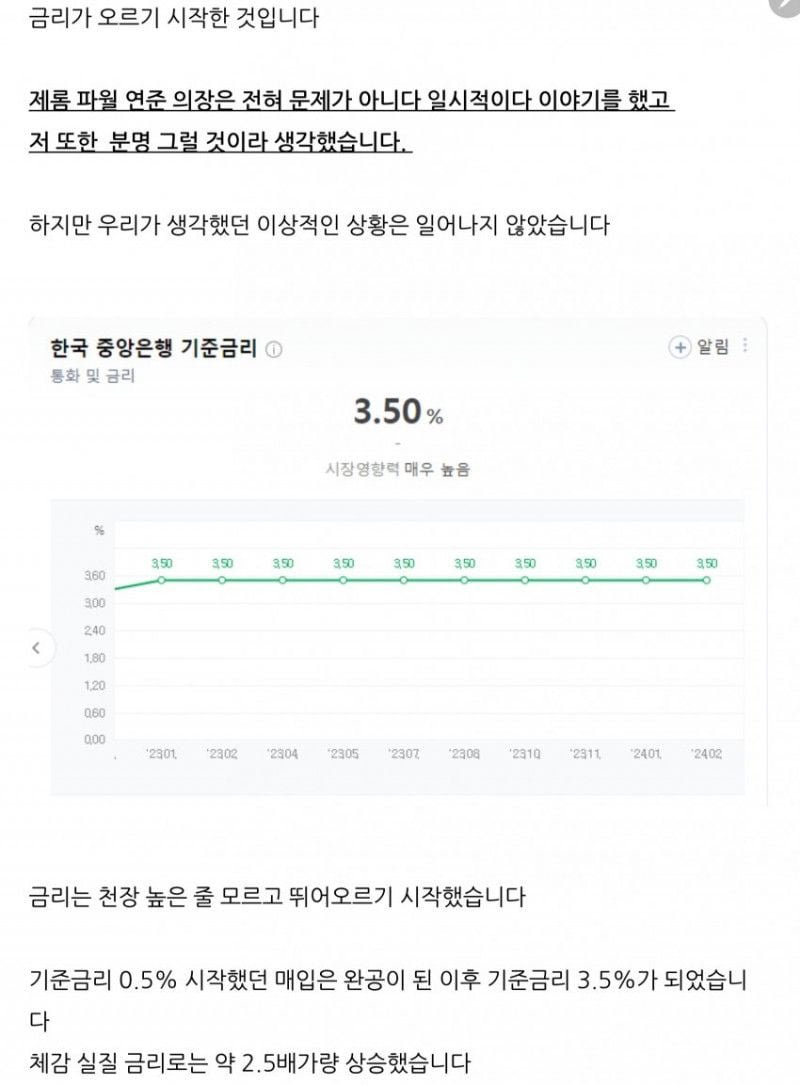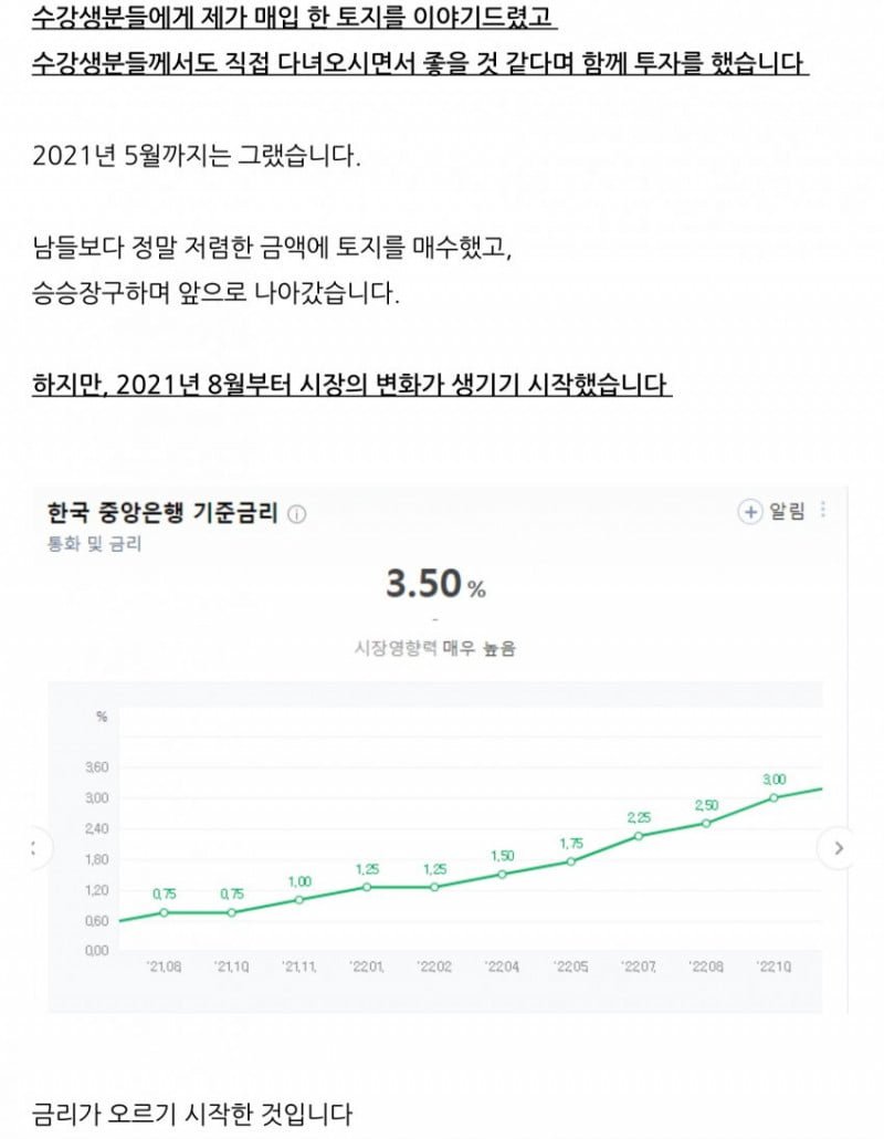 그러나, 부동산 시장의 변화로 인해 이상적인 상황이 일어나지 않았다는 소식도 전해졌다. 한국 중앙은행의 기준금리가 상승하며 시장에 변화가 생기기 시작했다고 한다. 족장 차원희는 이에 대해 전혀 문제가 아니라고 이야기하며 일시적인 현상이라고 설명했다. 그러나, 현실은 그의 예상과는 달랐고, 투자자들은 이러한 변화에 대처하는 방법을 찾고 있다. 돈을 버는 길에는 항상 변화가 있음을 명심해야 한다.