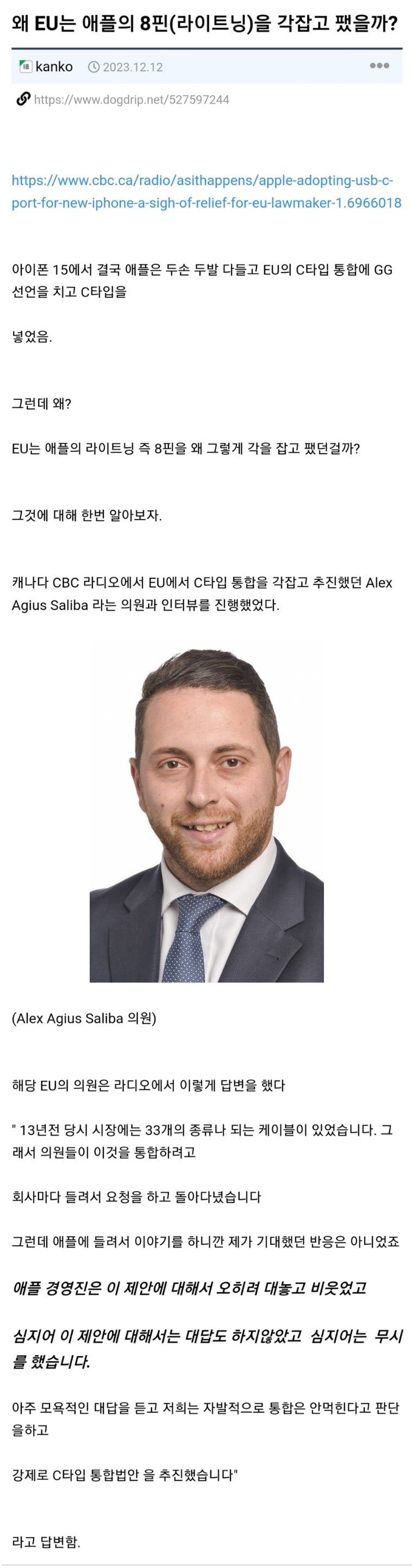 EU는 애플의 라이트닝(8핀)을 각잡고 팼던 이유에 대해 알아보자. 2013년 당시 시장에는 33개의 다양한 케이블이 있었는데, EU 의원들은 이를 통합하려고 노력했다. 그 중에서도 애플에게 문의를 해보았지만, 애플은 이를 무시하고 반대했다. 이에 EU는 자발적인 통합을 포기하고 C타입 통합법안을 추진했다. 결국 애플은 아이폰15에서 C타입을 도입하게 되었다.