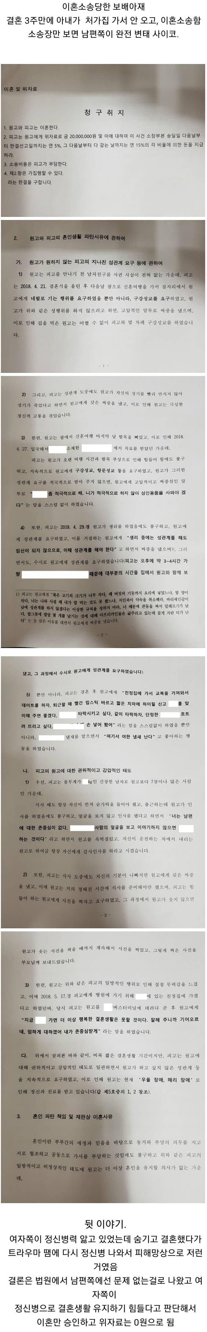 이혼 소송에서 보배아재는 원고가 지나친 성관계 요구로 인해 정신적 고통을 겪었다고 주장하고 있습니다. 결혼식 뒤 신혼여행 중 원고에게 구강 및 성적 접촉을 강요하고, 발목 부상으로 고통 받는 원고에게도 고압적인 태도를 보였다고 주장합니다. 이러한 행위로 원고는 성폭력 및 정신적 고통을 겪었다고 주장하고 있습니다.