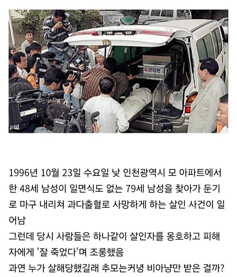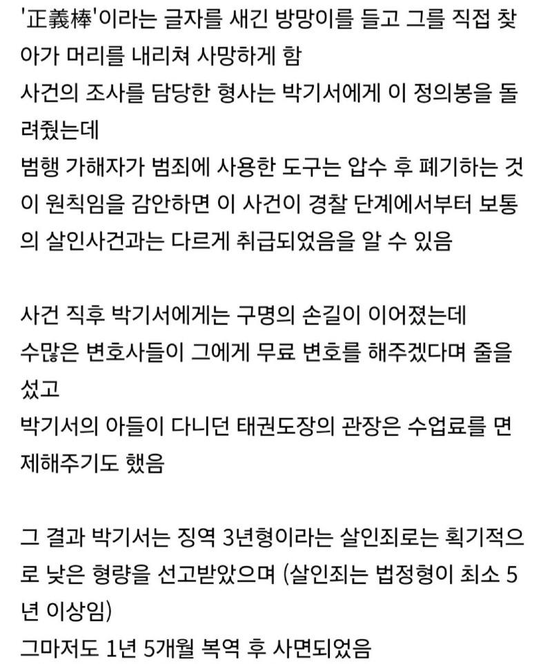 1996년 10월 23일 수요일, 인천광역시 모 아파트에서 유쾌한 48세 남성이 한 79세 남성을 둔기로 마구 내리쳐 사망시킨 살인 사건이 발생했다! 이에 인근 사람들은 살인자를 옹호하고 피해자를 비아냥으로 대우했는데, 과연 이 살인 사건의 배후에는 무슨 이야기가 있는 걸까? 그때 한 창이던 1951년 12월 12일에 전직 육군 소령으로 전역했던 안두희가 살해당했는데, 이후도 그를 처단하려는 시도가 있었지만, 못해서 살아남았다고! 이렇게 흥미진진한 사건들이 계속되다가, 드디어 1996년에는 '정의봉'을 새긴 방망이로 머리를 내리쳐 살해당한 박기서가 등장했다! 이벤트 풍성한 이야기들 속에 존재하는 결과를 가지고, 여러분은 어떤 생각이 드는지 궁금하지 않은가요?