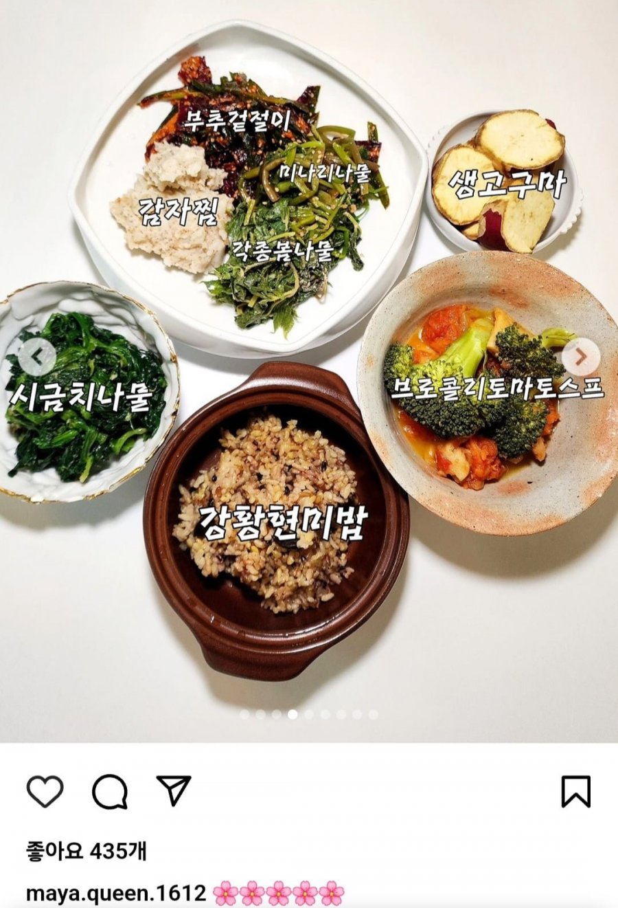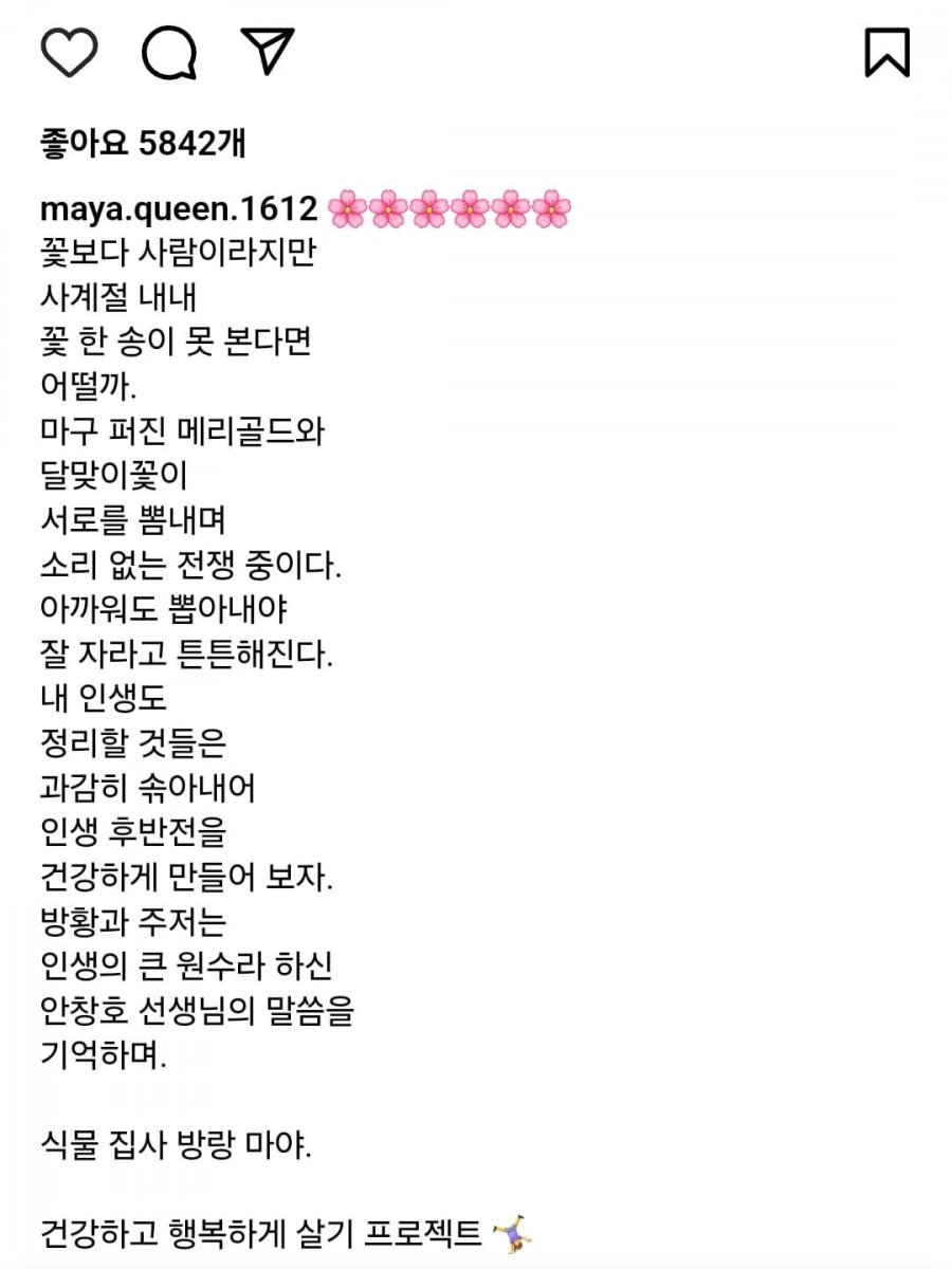 마야 퀸, 사천에서의 현미밥 연근 샐러드 미나리무침 브로콜리토마토스프! 콩나물 김칫국 감자강황 손질까치 브로콜리 소서아기, 산 속 연근 콩가루 차니 생고구마 좋아요 537개! 건강하고 행복한 삶을 살기 위해 집중하는 마야. 후반전 차기 위한 건강 프로젝트 시작! 방랑 마야, 토마토꽃송이버섯찜, 팔리하늘해에 도전.식물 집사, 쫓던데 좋아요 5842개! 사계절의 꽃 송이 하나 놓치기 싫어. 메리골드와 달맞이꽃의 전쟁! 당신의 건강한 삶을 위한 조언은?하지말아야 할 사람 들 정리하고 인생 후반전 시작!지금 당신의 인생 수정 중.