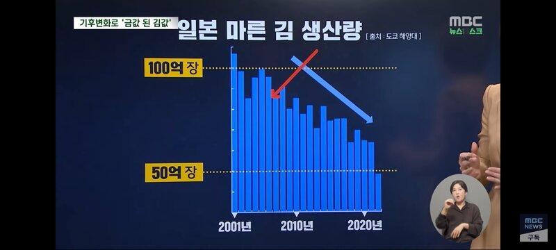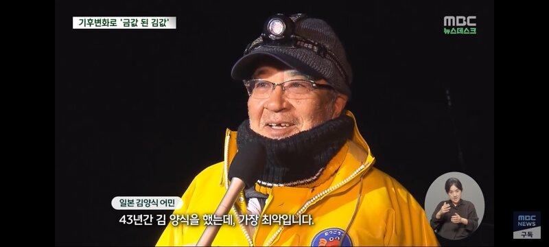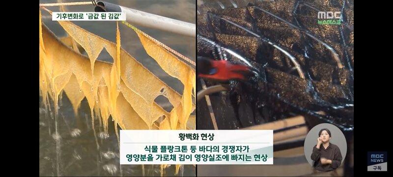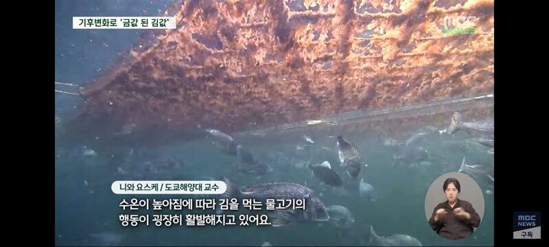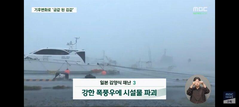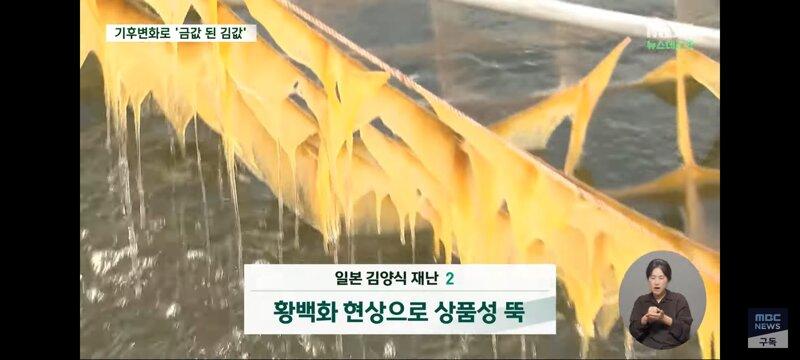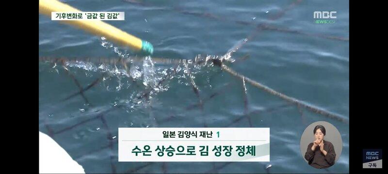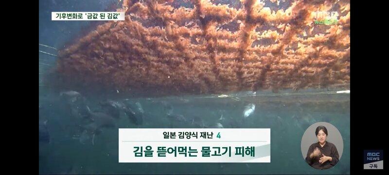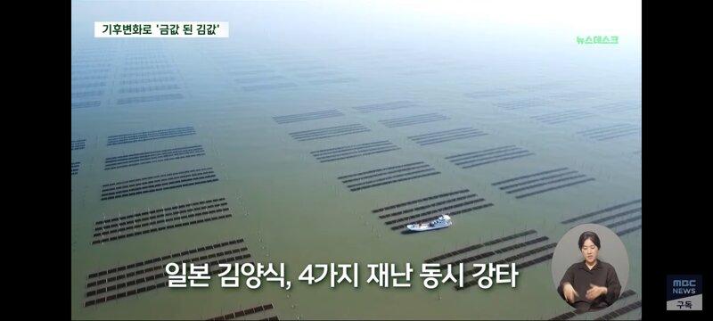 대형 기후 변화로 인해 일본의 김 양식장이 금값이 되었다고 최근 김 가격이 급등한 것으로 드러났다. 온도 상승으로 김 성장이 제동되고 황폐화된 상품성으로 어민들이 김 양식을 포기하기 일보직전인 상황이다. 이로 인해 김의 영양분을 가로채는 경쟁자들이 생겨 김이 영양실조에 빠지는 상황이 일어나고 있다. 일본의 김 양식 산업이 4가지 재해에 동시에 강타되어 위기에 놓인 것으로 보인다.