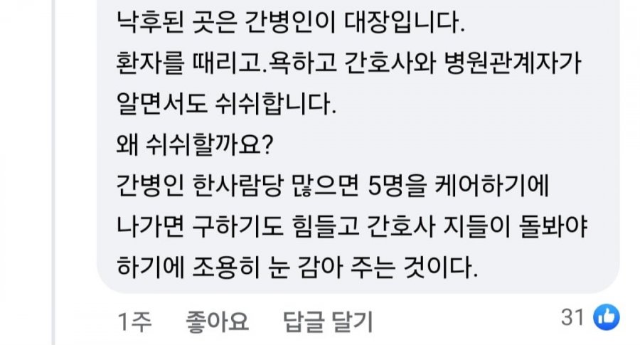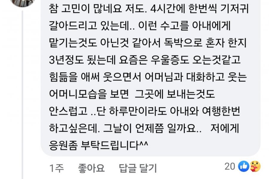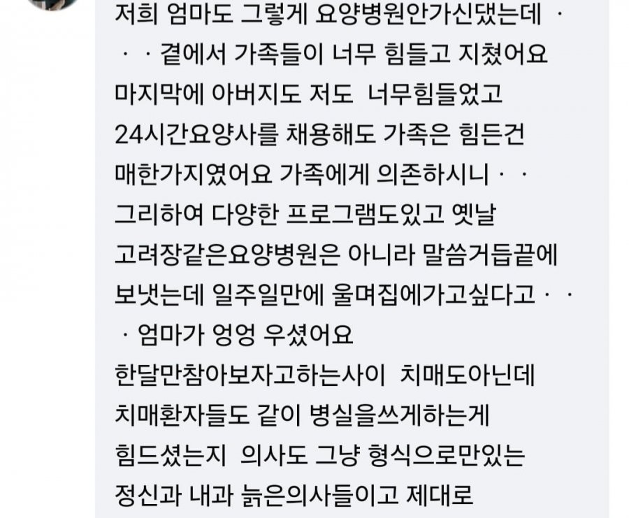 애드리브 대가! 국민배우 임현식 4인용식탁 토크! 슬기로운 노년생활 CHANNEL "나는 나이를 먹어 갈수록 요양병원에 대한 공포감이 생기는데 애드리브 대가! 국민 배우 임현식 4인용식탁 토크! 슬기로운 노년 생활 Λ CHANNEL 나는 절대 요양병원에 안 간다 참 고민이 많네요 저도. 4시간에 한번씩 기저귀 갈아드리고 있는데.. 이런 수고를 아내에게 맡기는것도 아닌것 같아서 독박으로 혼자 한지 3년정도 됬는데 요즘은 우울증도 오는것같고 힘듦을 애써 웃으면서 어머님과 대화하고 웃는 어머니모습을 보면 그곳에 보내는것도 안스럽고 ..단 하루만이라도 아내와 여행한번 하고싶은데. 그날이 언제쯤 일까요.. 저에게 응원좀 부탁드립니다^^ 1주 좋아요 답글 달기 낙후된 곳은 간병인이 대장입니다. 2003 환자를 때리고 욕하고 간호사와 병원관계자가 알면서도 쉬쉬합니다. 왜 쉬쉬할까요? 간병인 한사람당 많으면 5명을 케어하기에 나가면 구하기도 힘들고 간호사 지들이 돌봐야 하기에 조용히 눈 감아 주는 것이다. 1주 좋아요 답글 달기 저희 엄마도 그렇게 요양병원안가신댔는데. 곁에서 가족들이 너무 힘들고 지쳤어요 31ㅇ 마지막에 아버지도 저도 너무힘들었고 24시간요양사를 채용해도 가족은 힘든건 매한가지였어요 가족에게 의존하시니.. 그리하여 다양한 프로그램도있고 옛날 고려장같은요양병원은 아니라 말씀거듭끝에 •보냇는데 일주일