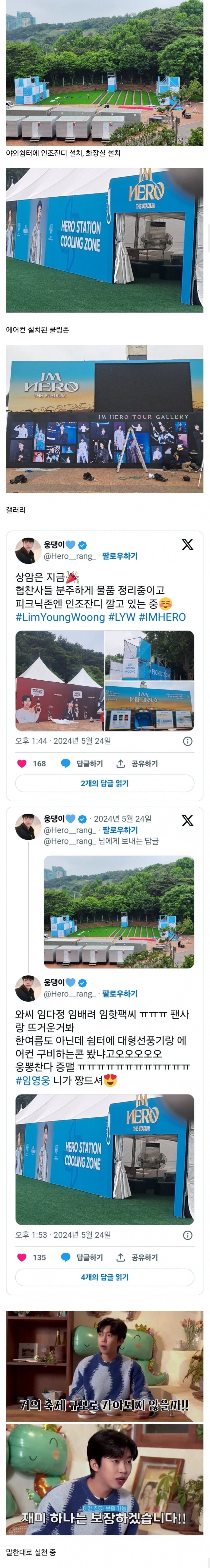 임영웅의 상암 야외 쉼터에서의 신비한 이야기! 협찬사들이 분주하게 물품 정리 중이라고? 피크닉존에 인조잔디를 깔고 있는 중이라니? 그게 다가 아니라구나! 대형선풍기와 에어컨 설치된 쿨링존 갤러리가 오픈됐다고!? 상암은 거의 축제 규모로 변모할 예정이라고!? 이러니 팬들은 열광하는 건 당연하지! 진짜 보증 가능 재미 하나는 보장하겠다!! 명실상부한 히어로 임영웅! 완벽한 영웅의 탄생!