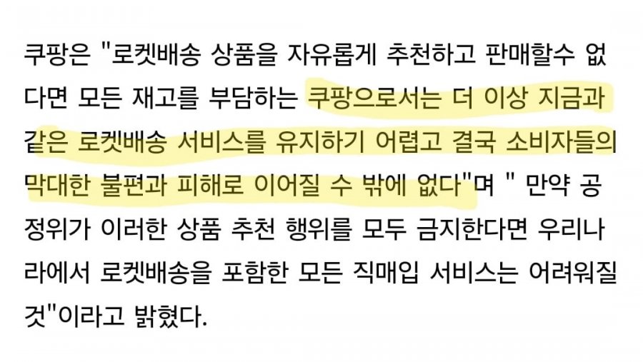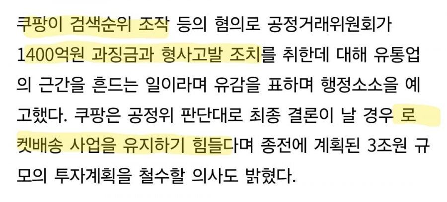 한국 온라인 쇼핑 업체 쿠팡이 혜택과 E7 K 쿠팡 검색순위 조작 혐의로 1400억원 과징금과 형사고발 조치를 받았다. 이에 쿠팡은 로켓배송 사업 유지가 어려워졌으며, 3조원 규모의 투자계획까지 철회할 예정이라고 밝혔다. 공정거래위원회 판단에 따라 로켓배송 상품을 추천하고 판매할 수 없다면, 소비자들에게 막대한 불편과 피해가 예상되며, 모든 직매입 서비스도 어려워질 것으로 예상된다.