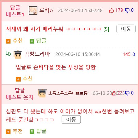 축구 역사상 가장 섬세하다는 볼터치.gif 동태탕 쪽지보내기자기소개아이디로 검색전체게시물 06-16 7,114 회 0 건 (소리없음. 찰싹 소리 나는것 같지만 없습니다) "인간 막창" 사건, 끈질긴 다툼으로 인한 과격한 얼굴 비난 및 부상 사고 발생! 누군가 땅에 떨구고는 굴리는 모습이 황당하고 가혹한 내용으로 화제를 모으고 있다. Var도 한번 다시 가동하여 레드를 주었을 정도로 압도적인 상황. 현재 상황 및 피해자의 인상을 지붕으로 치솟는 클로즈업 사진으로 확인해보자! 목록 이메일 주소는 공개되지 않습니다. 댓글 * 이름 * 비밀번호 * 비밀글 사용 제목 글쓴이 조회 날짜 오빠.. 그래도 신혼집은 강남으로 하자 지니까꿍 쪽지보내기자기소개아이디로 검색전체게시물 6,609 0 24-06-28 지니까꿍 쪽지보내기자기소개아이디로 검색전체게시물 6,609 24-06-28 미쳐버린 한국 예술계 근황 달콤별 쪽지보내기자기소개아이디로 검색전체게시물 6,796 0 24-06-28 달콤별 쪽지보내기자기소개아이디로 검색전체게시물 6,796 24-06-28 미쳐돌아가는 대한민국 밝은횃불 쪽지보내기자기소개아이디로 검색전체게시물 6,794 0 24-06-27 밝은횃불 쪽지보내기자기소개아이디로 검색전체게시물 6,794 24-06-27 싱글벙글 인종차별 반대 포스터 .jpg 아시가루 쪽지보내기자기소개아이디로 검색전체게시물 7,273 0 24-06-27 아시가루 쪽지보내기자기소개아이디로 검색전체게시물 7,273 24-06-27 이혼 3번한 박영규 재산분할 근황 밝은횃불 쪽지보내기자기소개아이디로 검색전체게시물 6,477 0 24-06-27 밝은횃불 쪽지보내기자기소개아이디로 검색전체게시물 6,477 24-06-27 연예인병 인성 터진 "이광수" ㄷㄷㄷㄷ 황희림 쪽지보내기자기소개아이디로 검색전체게시물 6,258 0 24-06-26 황희림 쪽지보내기자기소개아이디로 검색전체게시물 6,258 24-06-26 공짜 인터넷을 꿈꾸던 한 중학생의 이야기 밝은횃불 쪽지보내기자기소개아이디로 검색전체게시물 6,725 0 24-06-25 밝은횃불 쪽지보내기자기소개아이디로 검색전체게시물 6,725 24-06-25 거실에서 5미터 모텔뷰 아파트 ㄷ.. jpg 차하영 쪽지보내기자기소개아이디로 검색전체게시물 7,052 0 24-06-25 차하영 쪽지보내기자기소개아이디로 검색전체게시물 7,052 24-06-25 잔인한 현실을 보여주는 만화 고예 쪽지보내기자기소개아이디로 검색전체게시물 6,473 0 24-06-25 고예 쪽지보내기자기소개아이디로 검색전체게시물 6,473 24-06-25 연예인 실물 보고 현타 와버린 통닭천사 얼음사이다 쪽지보내기자기소개아이디로 검색전체게시물 7,227 0 24-06-24 얼음사이다 쪽지보내기자기소개아이디로 검색전체게시물 7,227 24-06-24 팩트로 제압당한 여성신문 하선훈 쪽지보내기자기소개아이디로 검색전체게시물 6,961 0 24-06-24 하선훈 쪽지보내기자기소개아이디로 검색전체게시물 6,961 24-06-24 억대 연봉 종합병원장 관두고 왕진만 하는 동네의원 원장 차하영 쪽지보내기자기소개아이디로 검색전체게시물 7,226 0 24-06-23 차하영 쪽지보내기자기소개아이디로 검색전체게시물 7,226 24-06-23 미국판 밀양사건 하선훈 쪽지보내기자기소개아이디로 검색전체게시물 7,378 0 24-06-22 하선훈 쪽지보내기자기소개아이디로 검색전체게시물 7,378 24-06-22 집에다 매점을 만들어 버린 어느 엄마 ㄷㄷㄷ.jpg 1 하선훈 쪽지보내기자기소개아이디로 검색전체게시물 7,123 1 24-06-22 하선훈 쪽지보내기자기소개아이디로 검색전체게시물 7,123 24-06-22 '여왕벌 놀이' 라고 아시나요? 모카크림 쪽지보내기자기소개아이디로 검색전체게시물 9,041 0 24-06-22 모카크림 쪽지보내기자기소개아이디로 검색전체게시물 9,041 24-06-22 허지웅 군대 발언 레전드... 금단비 쪽지보내기자기소개아이디로 검색전체게시물 6,793 0 24-06-21 금단비 쪽지보내기자기소개아이디로 검색전체게시물 6,793 24-06-21 교복이 피떡이 되도록 학폭 당했다는 연예인 하선훈 쪽지보내기자기소개아이디로 검색전체게시물 6,590 0 24-06-21 하선훈 쪽지보내기자기소개아이디로 검색전체게시물 6,590 24-06-21 인스타에서 난리난 변호사 광고 금단비 쪽지보내기자기소개아이디로 검색전체게시물 6,530 0 24-06-20 금단비 쪽지보내기자기소개아이디로 검색전체게시물 6,530 24-06-20 일본에서 난리인 베트남 범죄조직.jpg 몽비쥬 쪽지보내기자기소개아이디로 검색전체게시물 6,452 0 24-06-20 몽비쥬 쪽지보내기자기소개아이디로 검색전체게시물 6,452 24-06-20 AI 야 고마워 ^^ 도레미 쪽지보내기자기소개아이디로 검색전체게시물 6,489 0 24-06-20 도레미 쪽지보내기자기소개아이디로 검색전체게시물 6,489 24-06-20 우와~~이정도의 필기실력이라면 성적이 궁금합니다 몽비쥬 쪽지보내기자기소개아이디로 검색전체게시물 6,084 0 24-06-19 몽비쥬 쪽지보내기자기소개아이디로 검색전체게시물 6,084 24-06-19 나영석 PD가 돈이 많아도 불안한 이유 동태탕 쪽지보내기자기소개아이디로 검색전체게시물 7,033 0 24-06-18 동태탕 쪽지보내기자기소개아이디로 검색전체게시물 7,033 24-06-18 350억 있는거 깔끔하게 인증한 유튜버 모카크림 쪽지보내기자기소개아이디로 검색전체게시물 6,708 0 24-06-18 모카크림 쪽지보내기자기소개아이디로 검색전체게시물 6,708 24-06-18 쿠팡 반격 시작 됐다 ㄷㄷ 전쟁 시작인가 ㄷ