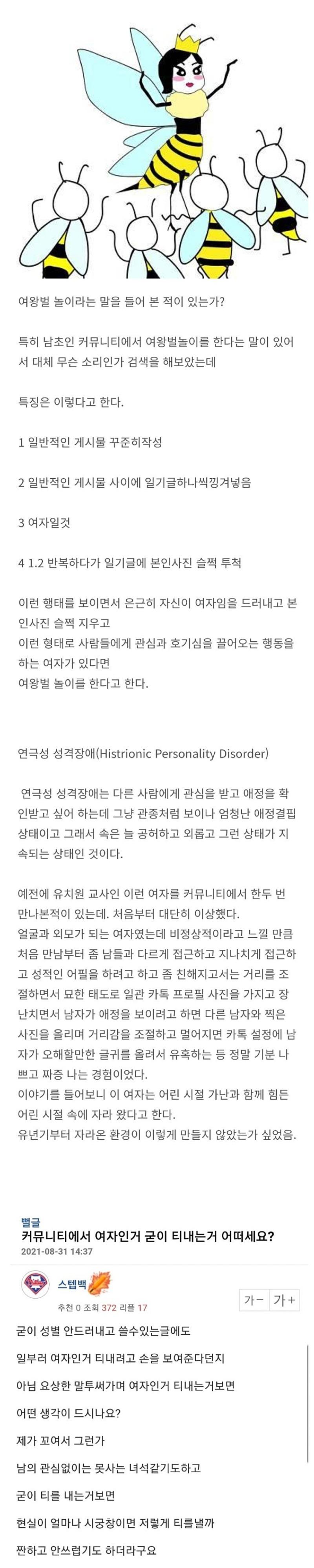 세상에 여왕벌 놀이란 말이 존재한다고 하는데, 이는 정말 믿을 만한 이유가 있는 것으로 알려졌다. 여자인 것이 확실한 사람이 온라인 커뮤니티에서 여왕벌 놀이를 한다는 소문이 돌았다. 이 여자는 일반적인 게시물을 꾸준히 작성하면서 자신의 사진을 암시적으로 올리고, 다른 남자들을 유혹하기도 했다는 것이다. 이 행동은 바로 연극적 성격장애로 해석되는데, 다른 사람의 주목을 끌고 싶어하는 병적인 욕망의 표현인 것이다. 혹시 당신도 여왕벌 놀이의 피해자가 될 수 있을지 모른다! 함께 주의하기 바란다!