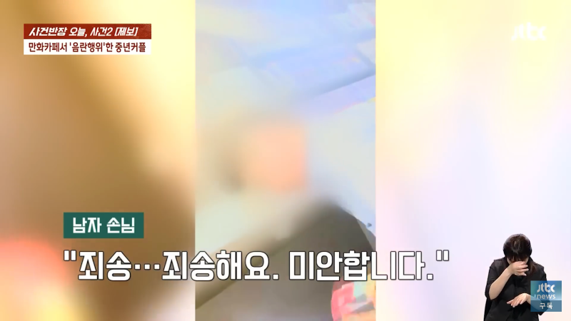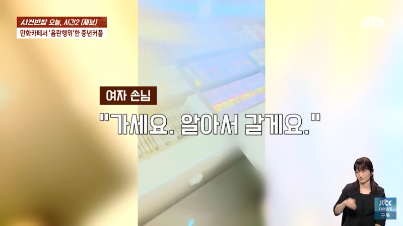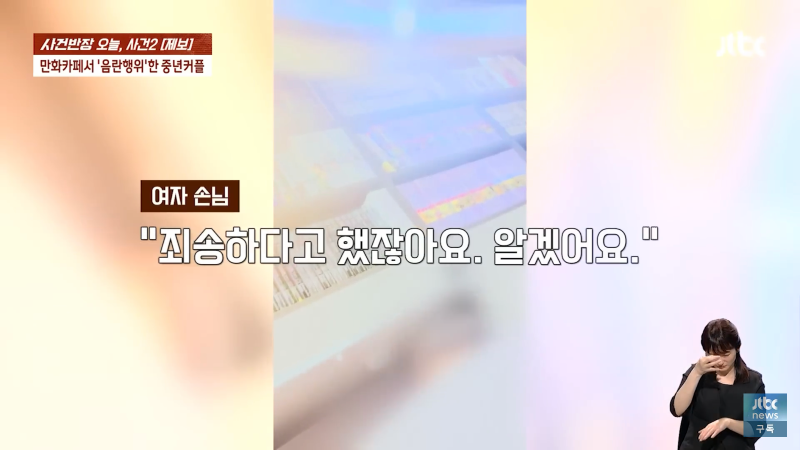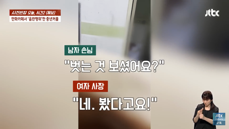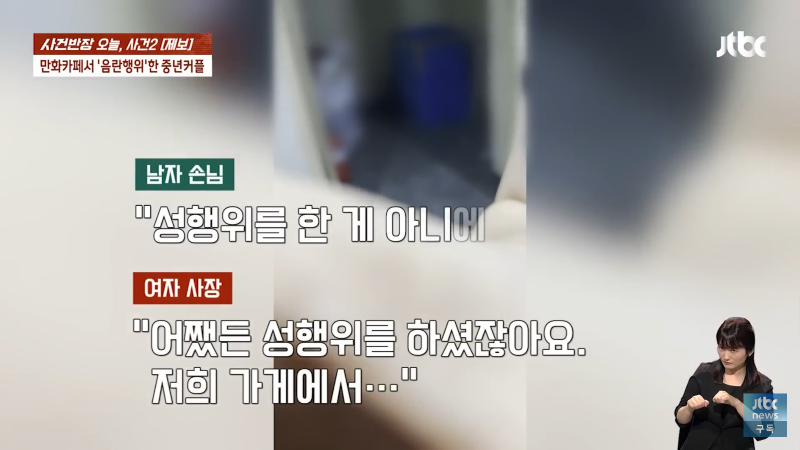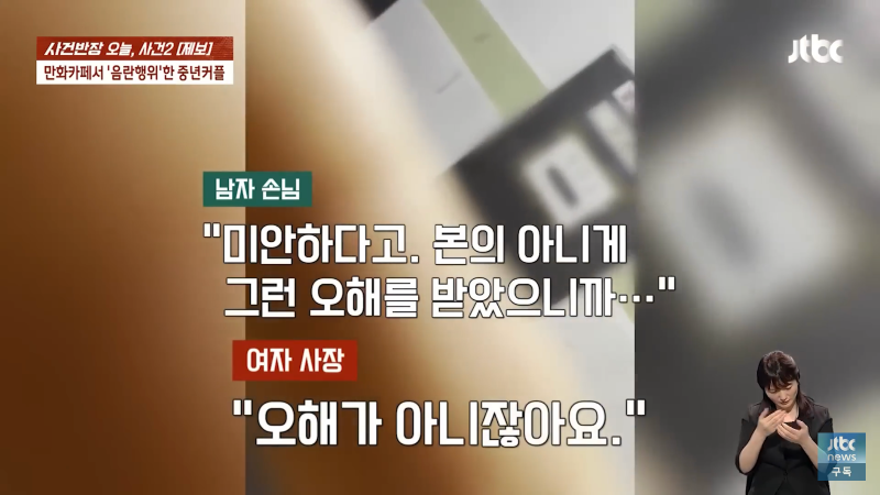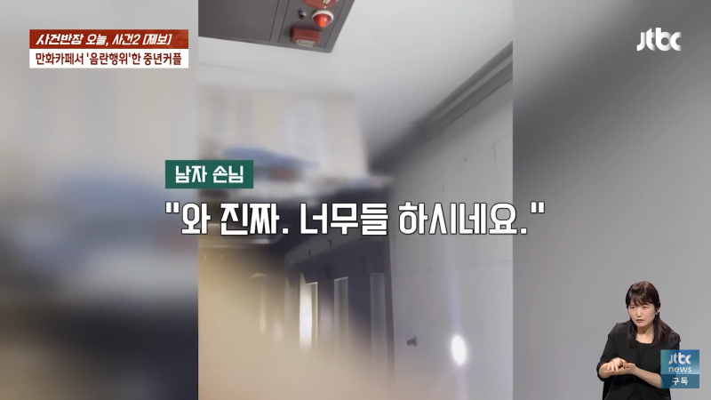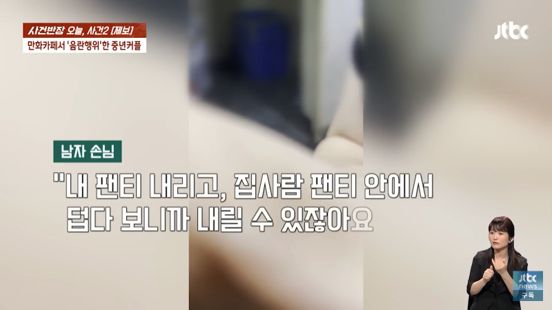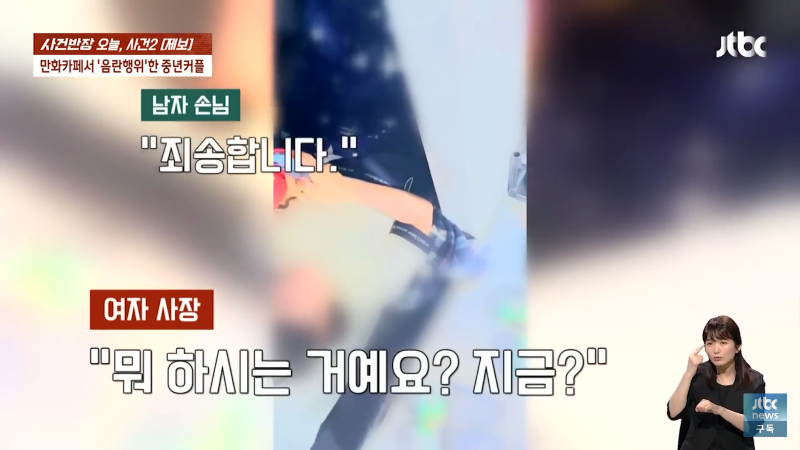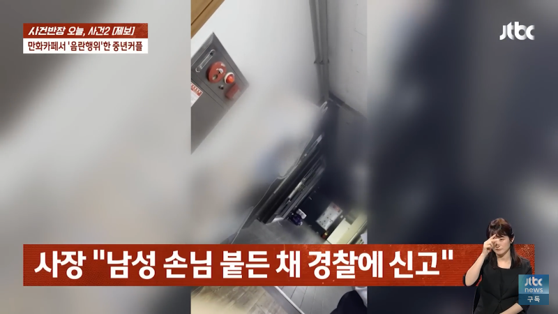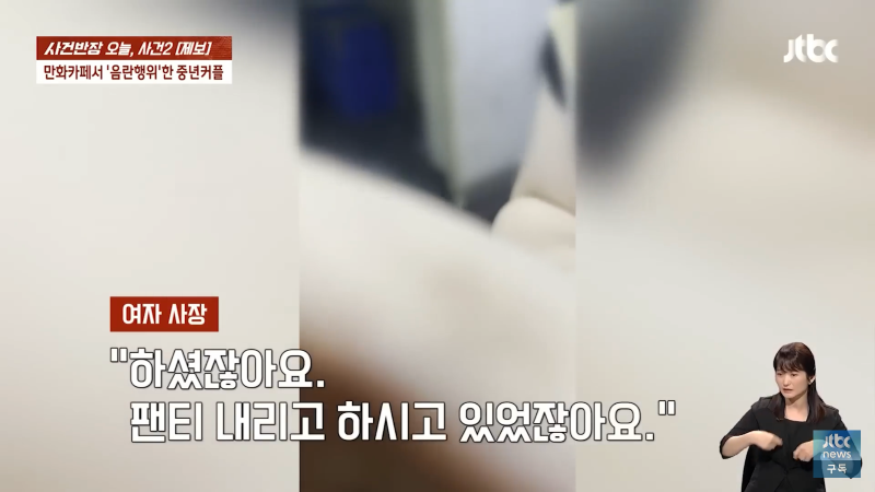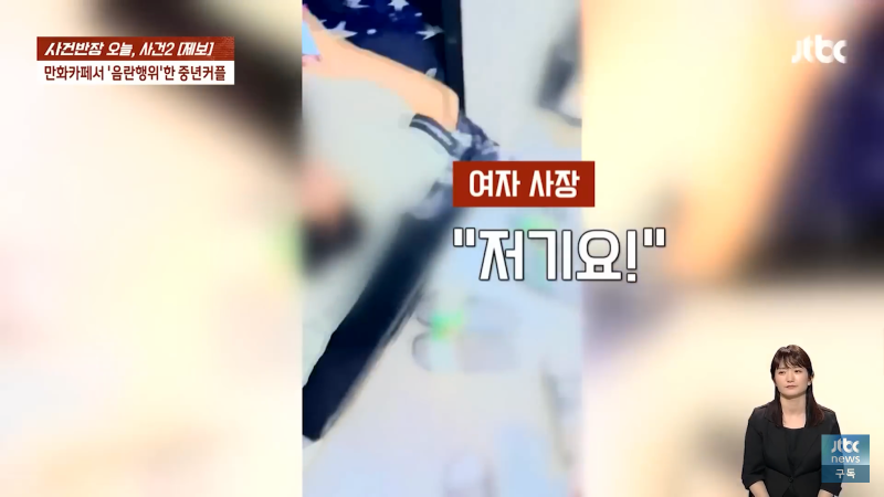 만화카페에서 음란한 행위를 한 중년 남녀가 오늘 사건반장에 올라왔습니다. 남자 손님은 "죄송합니다, 미안합니다"라고 말하며 반성했고, 여자 사장은 "뭐 하시는 거예요? 지금?"이라며 충격을 표현했습니다. 이에 여자 손님은 "가세요. 알아서 갈게요"라며 사과를 했지만, 사장은 경찰에 신고하고 도망가라고 외쳤습니다. 이같은 사건으로 만화카페는 큰 파장을 일으켰고, Jtbc 사장도 신경을 곤두세우며 비상계단으로 도망가라고 경고했습니다. 이 사건은 지금도 계속 발전 중이니 주의가 필요합니다!