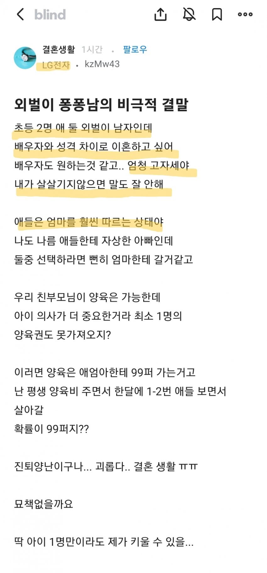 퐁퐁이의 외벌이 화제! LG전자 kzMw43 외벌이 퐁퐁남의 비극적 결말! 초등 학생 2명 애 남기고 이혼 위기! 엄하게 살아가며 양육권 가져올 수 없을까? 미래는 어떻게 될까? 판단장애로 괴로워하는 외벌이 남자의 이야기! 결혼 생활 탈출의 길은? 당신의 선택은?_JOINSEQUENCE_MARKER 진퇴양난이구나... 괴롭다..결혼 생활 ㅠㅠ 묘책은 없을까? 삶의 패배, 이혼의 그림자, 그리고 맹세한 사랑의 결말! 너무나 슬픈 실화를 지금 당신이 결정해야 한다! 내 가슴이 뜨거워지는 이야기, 외벌이 키팅의 최후! 당신이 새로운 시작을 할 때! 함께 결정해보자!