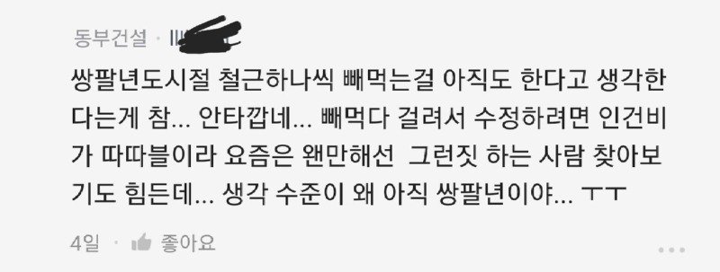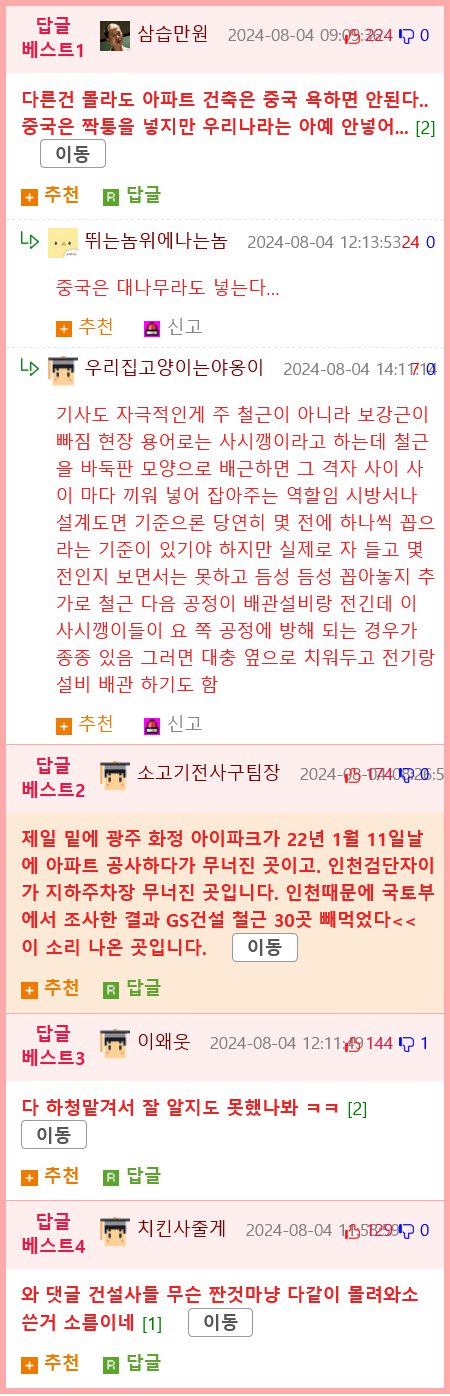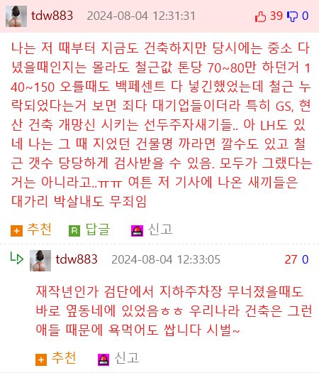 아! 전세계적인 아파트 철근 레전드.txt 파일이 공개되었습니다! 2020-2021년에 건설된 아파트들이 걸러야 할 필수 정보를 제공해드립니다. 자재값 폭등으로 철근 콘크리트를 아낄 수밖에 없는데, 실제로 필요한 10개를 넣는 대신 6-7개만 사용했던 건설업체들이 존재했습니다! 감리도 제대로 감독하지 못했고, 시행사들도 문제 속에 얽혀 있었습니다. 2022년, 이제는 고쳤을 수도 있는 문제이지만, 참을 수 없을 정도의 실수가 넘쳤던 과거를 지금까지 공개하고 있습니다. 극단적인 상황이라고 하는데, 아무래도 너무 과해도 과하지 않다면서요. 혹시 알고 계신 분이 있다면 꼭 확인해보시길 권장드립니다. 자재값은 두고두고 회자되어지는 법이 없을테니까요! 인증된 SK에코플랜트의 정신병 같은 소식에 귀 귀 기울여주시길 바랍니다!