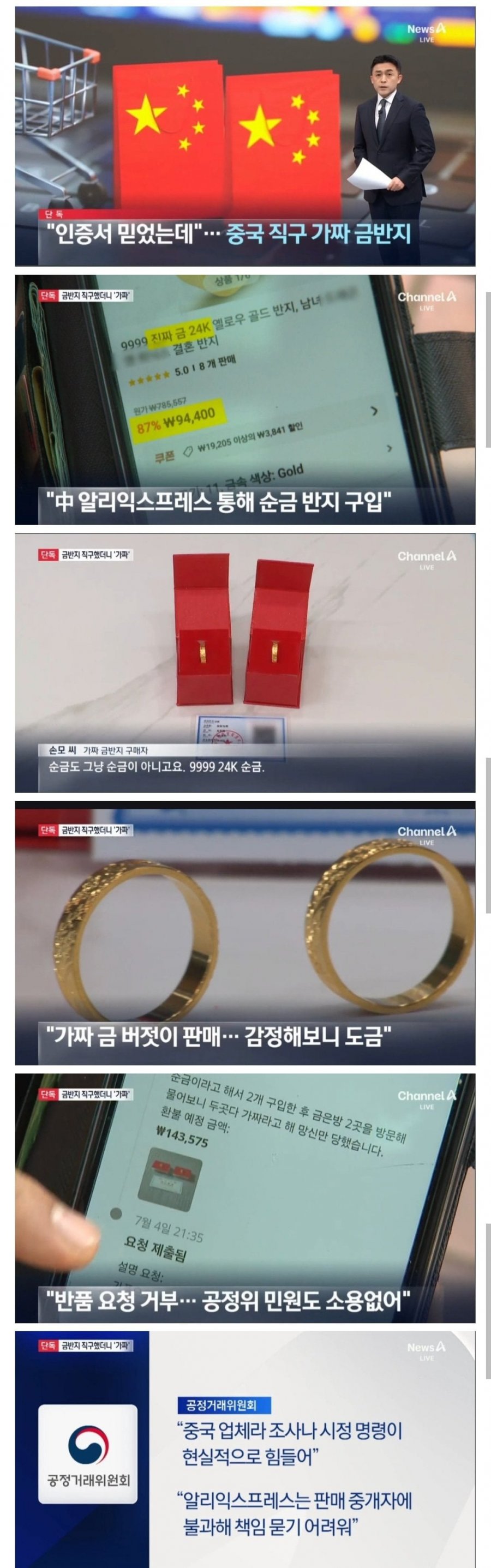 한 남성이 알리익스프레스를 통해 24K 순금 반지를 구입했지만, 실제로는 가짜 제품이었다는 사실을 알게 되었습니다. 이후 여러 골드 숍을 방문해도 결과는 마찬가지였고, 환불을 요청했지만 거부당했습니다. 공정거래위원회에 민원을 제기했지만 중국 업체이기 때문에 시정명령을 내리기 어렵다는 답변을 받았습니다.