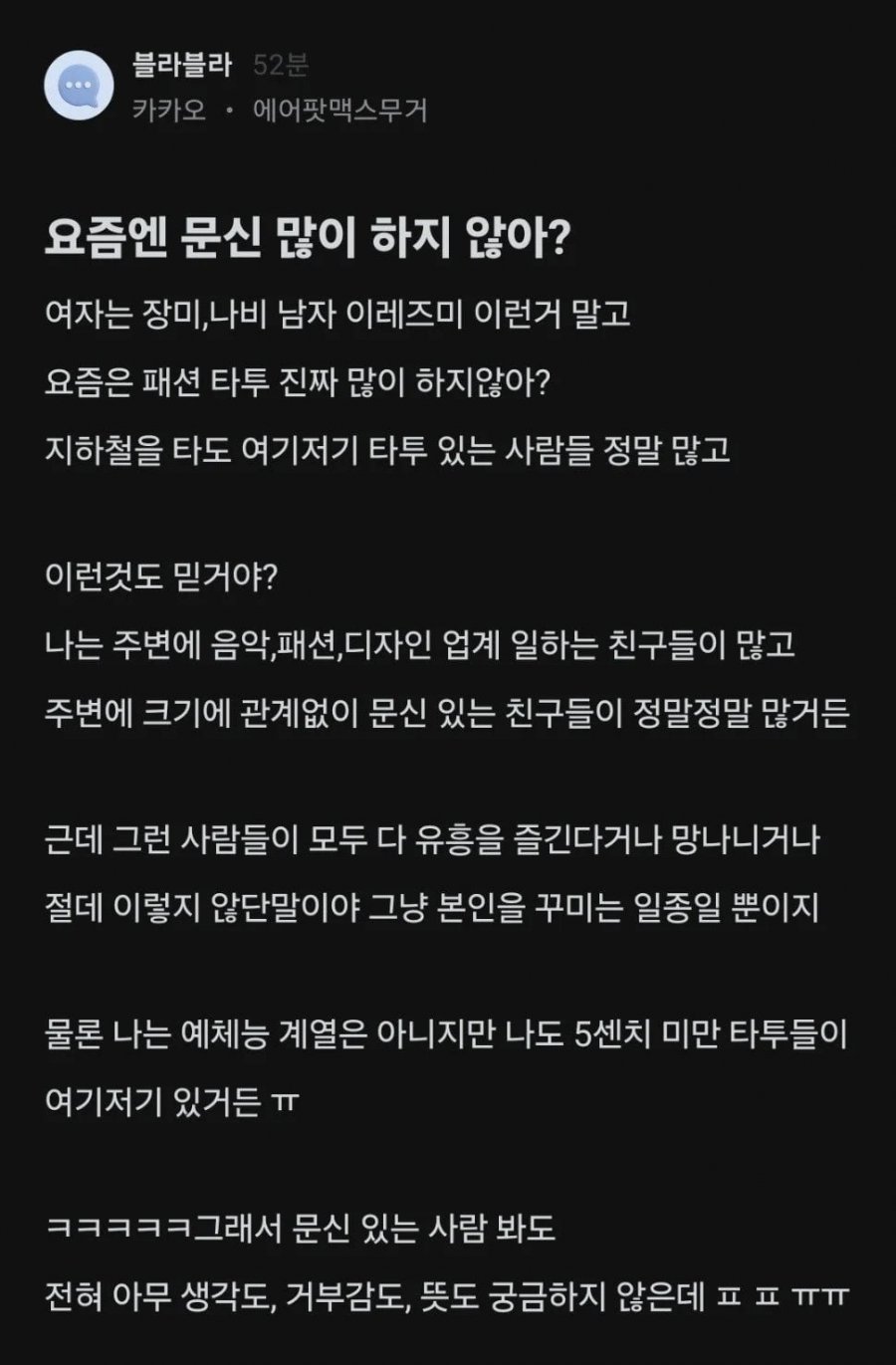 이제는 대기업 직원들조차도 문신을 거르는 시대!? 요즘 패션타투가 인기라는데, 모든 사람이 유흥을 즐겁거나 망나니일까요? 주변에서도 문신을 한 사람들이 많은데, 이들은 단지 본인을 꾸미는 것뿐이에요. 남의 눈치를 보며 문신을 한 사람들에게 왜 이런 의문을 갖을까요? 이제는 문신해도 괜찮다는 말을 듣고 싶어하는 사람들이 늘어나고 있는 것으로 보입니다.');?>"