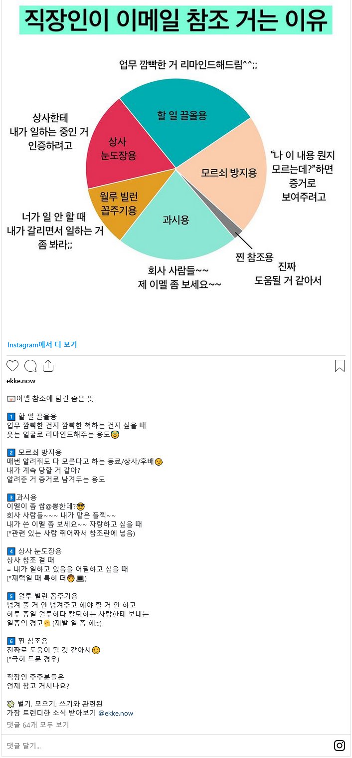 중이세요? 직장인들의 이메일 참조하는 이유를 쉽게 이해하고 흥미 진진하게 요약해보겠습니다! 이메일 참조는 업무 깜빡한 것을 리마인드하기 위해서도, 상사에게 할 일을 끌올용으로 증명하기 위해서도, 모르쇠 방지용으로 사용됩니다. 또한, 과시용으로 자신이 참조했다는 것을 알리고 싶을 때도 사용됩니다. 상사에게 할 일을 어필하고 싶을 때나, 해야 할 일을 모르고 있거나, 게을러서 업무를 소홀히 하는 사람에게도 사용됩니다. 언제나 도움이 되는 참조 이메일을 잊지 말고 잘 활용해보세요!