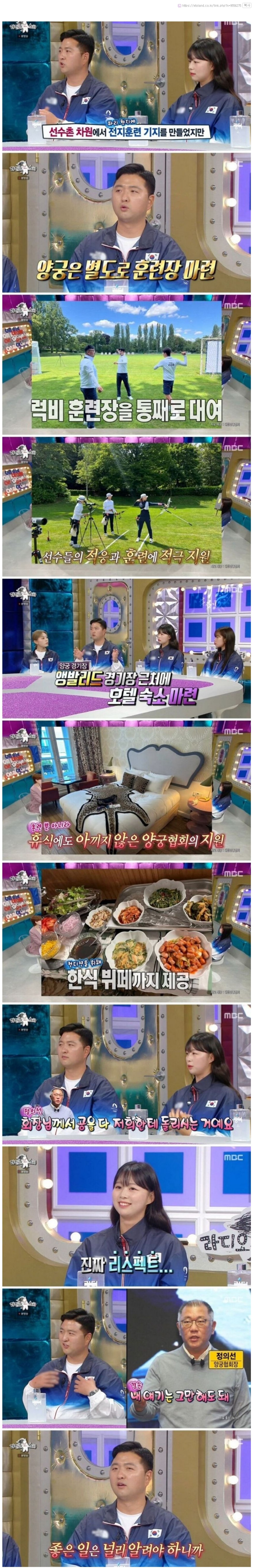양궁협회장이 현지 파리에서 선수들에게 특별한 훈련장을 마련했다! 4양궁은 MBC 럭비 훈련장을 전체 대여해 선수들의 적응과 훈련을 지원한다고 했다. 또한, 양궁 경기장 근처에는 모텔 숙소를 마련하여 휴식과 대비를 제공하며, 한식부페까지 제공해 컨디션을 유지한다. 대학생회장은 "정의선 회장님께서 공을 다 저희한테 돌리시는 거예요" 라고 감동적인 이야기를 전했다. 이러한 지원으로 양궁 협회는 진정한 리스펙터를 받을 것으로 기대된다!