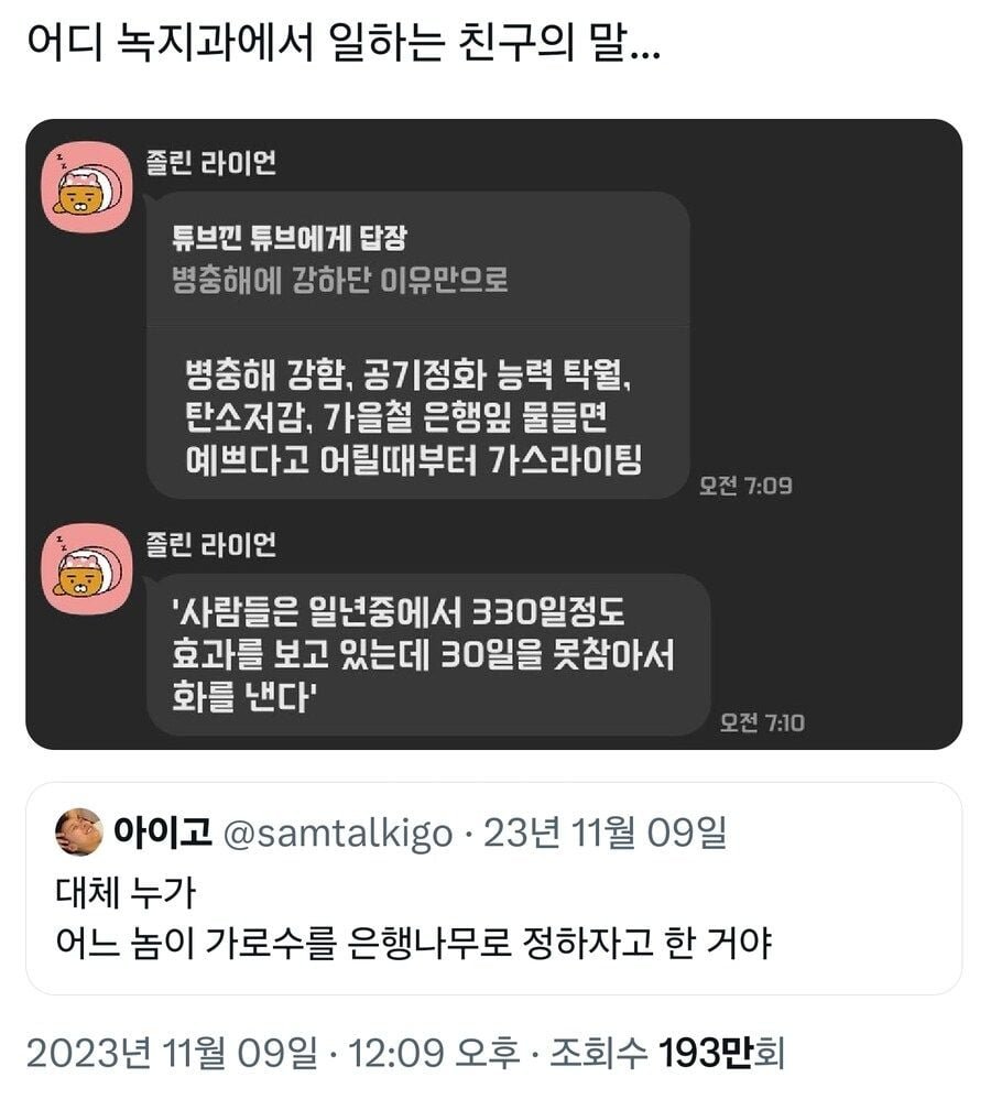 졸린 라이언이라는 한 사용자는 "사람들은 일 년 중 330일 정도가 은행나무의 효과를 보고 있으면서, 30일을 참지 못하고 화를 낸다"는 충격적인 주장으로 친구들의 관심을 끌었다. 그가 말하는 효과는 바로 병충해에 강한 특성과 공기 정화 능력뿐만 아니라, 탄소 저감의 효과까지! 그러나 누군가가 "대체 누가 은행나무를 가로수로 정하자고 했느냐?"며 분노의 목소리를 높였다. 무려 조회수 193만 회를 기록한 이 발언은 단순한 나무의 문제를 넘어, 국가 정책에 대한 불만으로 번져갔다.
