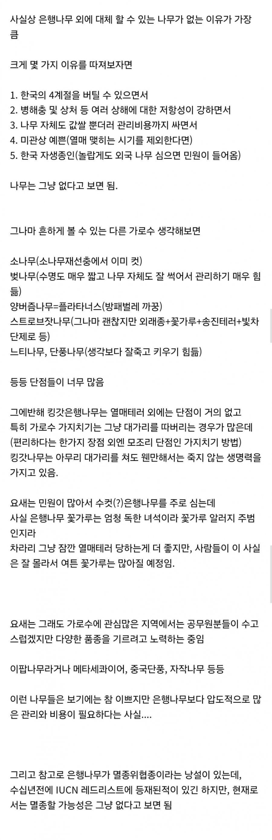 가장 큰 이유는, 대체할 수 있는 나무가 없다는 사실! 한국의 4계절을 견딜 수 있는 다른 나무가 없다는 결론에 도달하며, 은행나무는 결국 찾는 이가 없던 '악착같은 생명력'을 가진 나무로 여겨지고 있다. 결국, 이 모든 논란 속에서 사람들은 은행나무의 지속적인 존재에 깊은 의문을 품게 됐다. "우린 계속해서 세금을 낭비하며 멀쩡한 나무를 없애고 이상한 나무를 심는 일을 반복하게 되는 걸까?"라는 질문은 계속해서 여운을 남겼다.