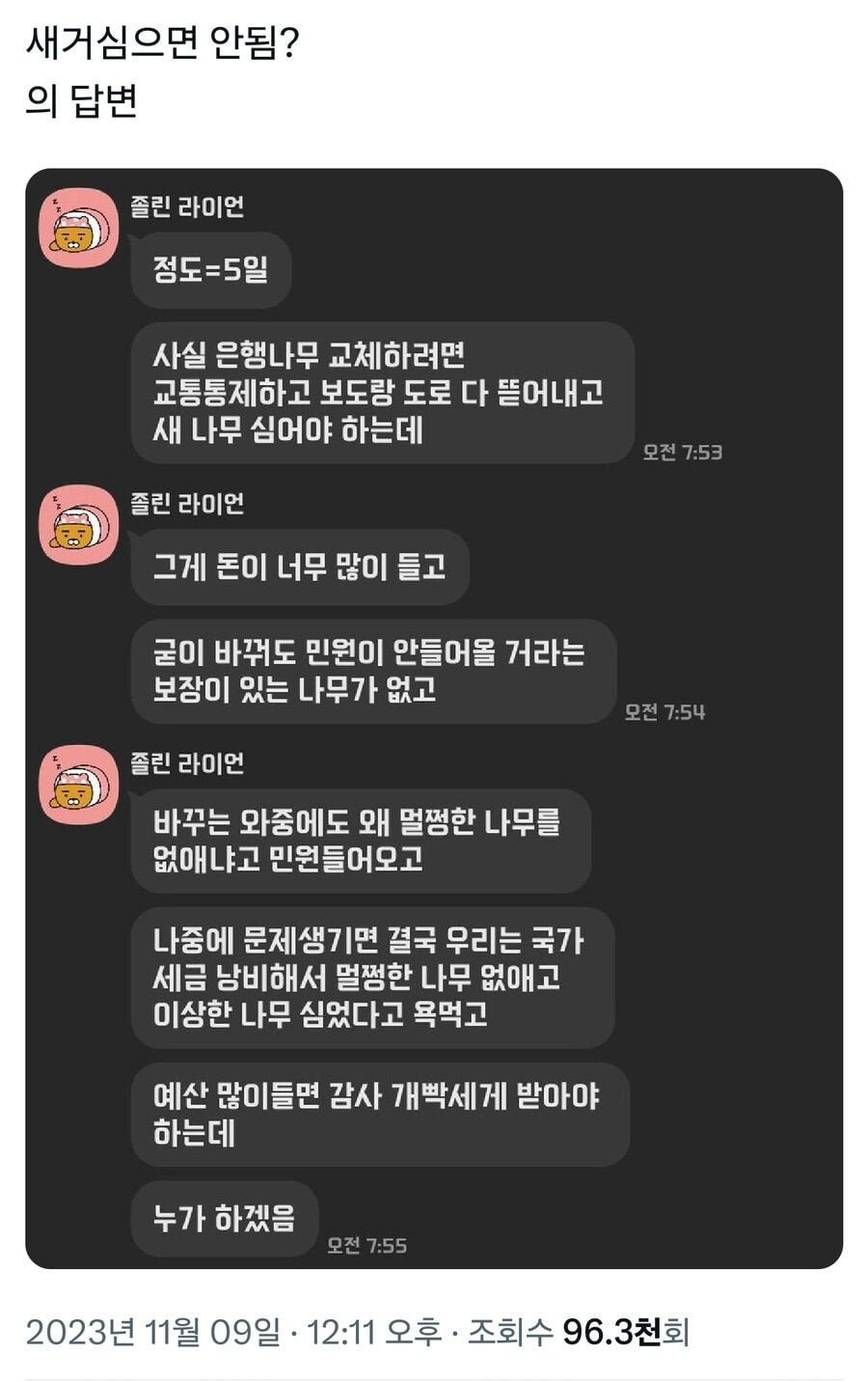그런데, 이 논란은 여기서 끝이 아니었다. 졸린 라이언은 "은행나무를 교체하려면 교통 통제와 보도, 도로를 다 뜯어내고 새 나무를 심어야 하는데, 그 과정이 너무 복잡하고 비용도 만만치 않다"는 사실을 알렸다. 더욱이, "그런 일을 겪고 나서 이상한 나무를 심었다고 욕먹는 것"에 대한 불안감까지 토로하며, 실제로 민원이 발생할 가능성까지 우려했다.