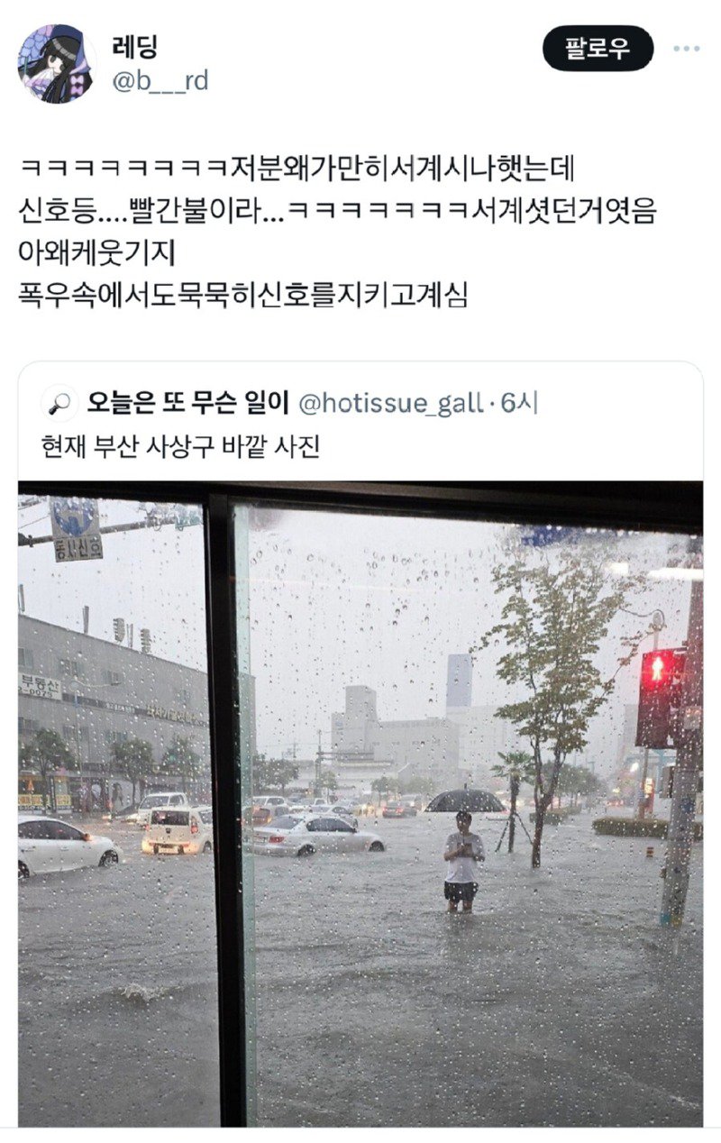 한 이용자는 "폭우 속에서도 신호를 지키는 그의 모습, 정말 양심 냉장고를 줘야 하는 것 아니냐?"라며 그의 굳건한 의지를 칭찬했습니다. 또 다른 댓글에서는 "저..는..늘...지..켜..요"라는 유머로 해당 장면을 부각시키며, 변함없는 질서 유지를 강조했습니다.