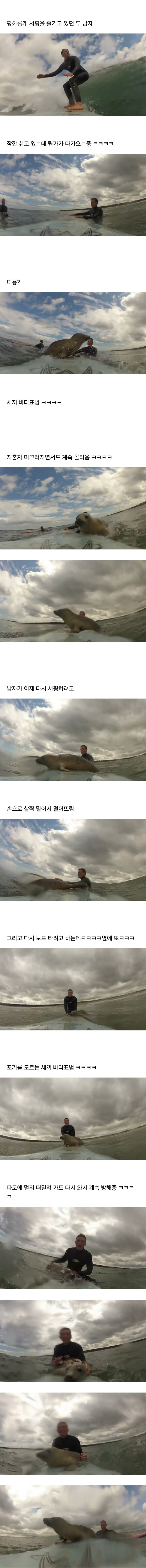 서핑하는데 새끼 바다표범이 자꾸 서핑보드를 탐냄