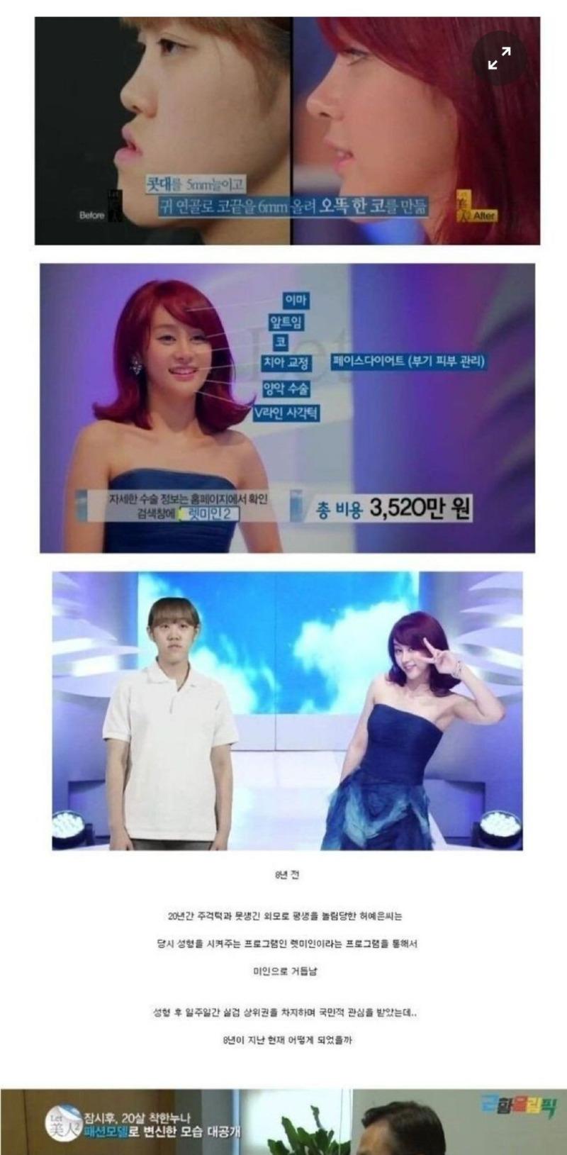 주걱턱녀로 알려진 허예은씨의 파란만장한 이야기가 드디어 밝혀졌습니다! 고작 8년 전, 외모로 인해 평생을 놀림받던 그녀가 성형 프로그램 '렛미인'을 통해 완전히 변신한 이후의 삶은 과연 어떤 모습일까요?