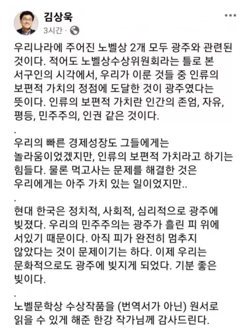 한국의 물리학자 김상욱은 최근 충격적인 발언을 통해 노벨상 수상이 광주와 깊은 연관이 있음을 주장했다. 그는 "우리나라에서 수여된 노벨상 두 개는 모두 광주와 관련이 있다"며, 광주가 인류의 보편적 가치, 즉 인간의 존엄성과 자유, 평등, 민주주의, 인권의 상징이 되었다고 강조했다. 이는 서구의 시각에서 바라본 한국의 성취가 광주에 뿌리내려 있다는 것을 의미한다.