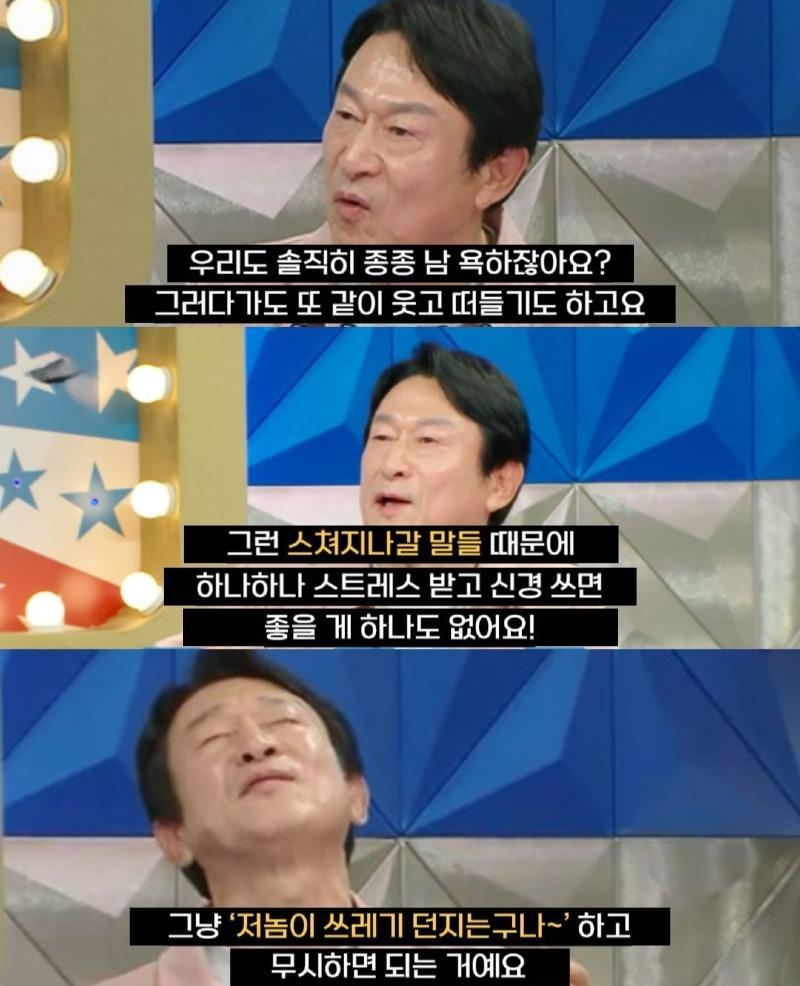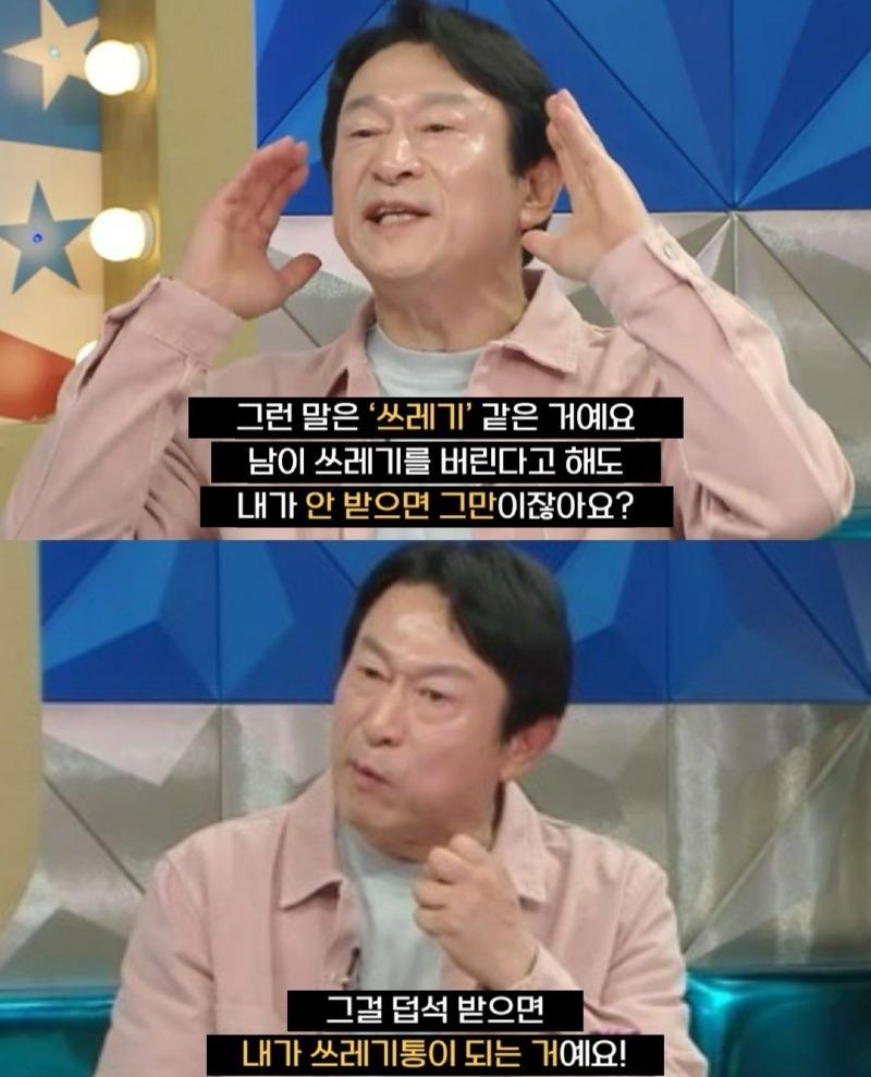 하지만 김응수는 그날의 일을 통해 중요한 진리를 깨달았다. 그는 바로 "남의 험담은 '쓰레기'와 같아서 절대 기죽거나 기분 나빠할 필요 없다"고 주장했다. 그의 철학은 남이 버리는 쓰레기를 내가 받아들일 필요 없다라는 단순한 진리에서 시작된다. 그는 "남의 쓰레기를 덥석 받으면 내가 쓰레기통이 되는 것"이라며 강력한 메시지를 던졌다.