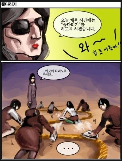 장군님은 피곤하신 목소리로 "이만 들어가셔서 눈 좀 붙이시지요"라며 평범한 사람으로 보이려 애썼지만, 체육 시간에 일어난 일은 전혀 평범하지 않았다. 이날 운동은 "줄다리기"라는 껍데기를 쓴 전투였다. 아이들은 "와~! 힘 좀 써볼까!!"라며 기세를 올렸고, 숨 막히는 다리싸움이 시작됐다.
