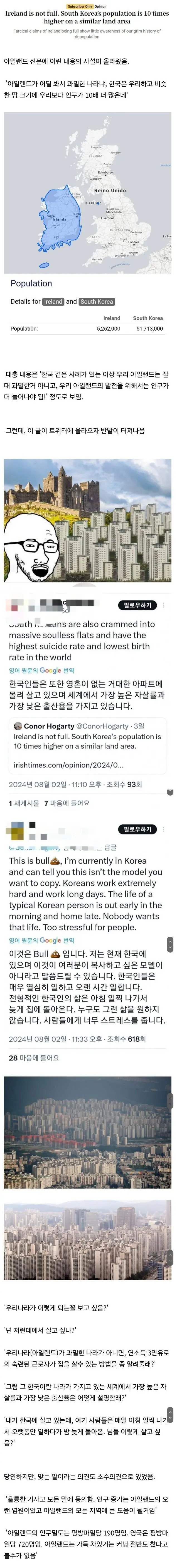 아일랜드의 한 신문에서 믿을 수 없는 발언이 나왔습니다! ‘아일랜드가 과밀하다는 주장은 황당하다’라는 제목으로, 한국의 인구 밀도를 언급하며 아일랜드의 인구 수가 훨씬 적다는 사실을 부각시키고 있습니다. 신문에 따르면, 한국은 아일랜드와 비슷한 면적에 불과한데도 불구하고 그 인구는 무려 10배나 많다는데요! 아일랜드를 과밀한 나라로 보는 것이 얼토당토 않은 주장이라는 것입니다.