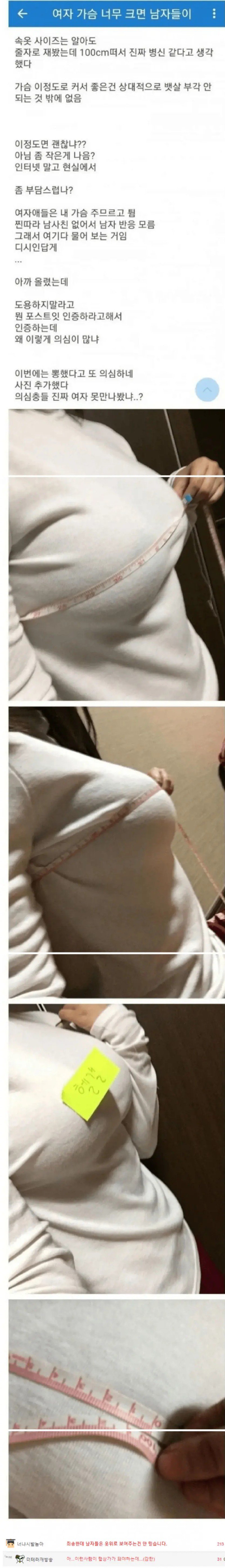 헬스 갤러리에서 충격적인 사건이 발생했다! 한 여성이 자신의 가슴 사이즈가 100cm라고 주장하며 세간의 화제가 되고 있다. 이 여성은 자신의 신체적 특성과 관련하여 남자들의 반응에 대해 걱정하고 있으며, “이 정도면 괜찮냐? 아니면 좀 작은 게 나은가?”라며 묻고 있다.