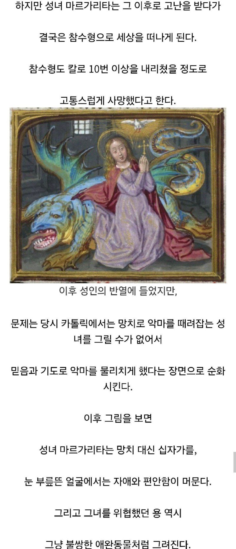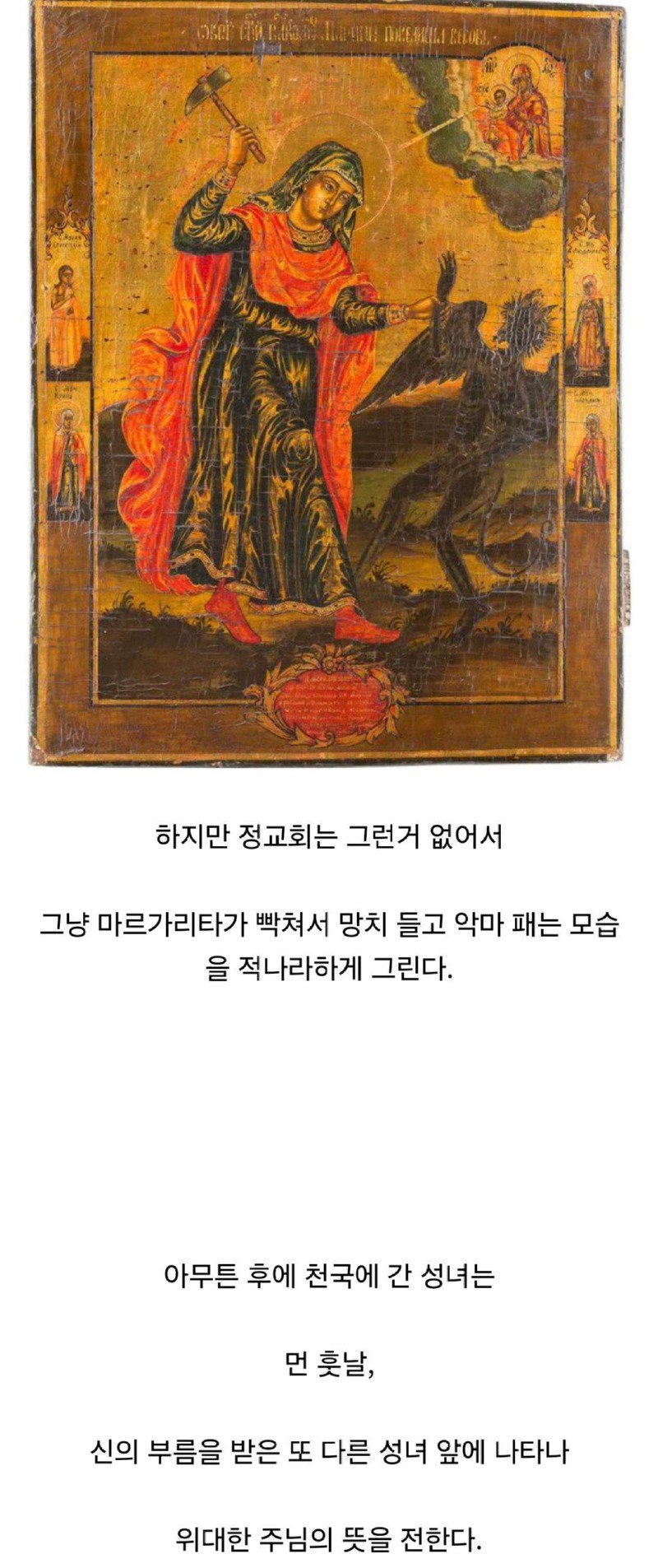 악마의 유혹을 물리친 마르가리타의 이야기는 단순한 전쟁처럼 보이지만, 그 속에는 굴욕과 고통, 그리고 신앙의 힘이 가득 담겨 있다. 그녀의 이 전투는 단순한 시련을 넘어서, 믿음을 지키는 것이 어떠한 의미인지, 아름다움이 진정한 저주가 될 수 있는지를 생각하게 한다. 이제 그녀는 성녀로서의 위대한 전설로 남을 준비를 하고 있다!