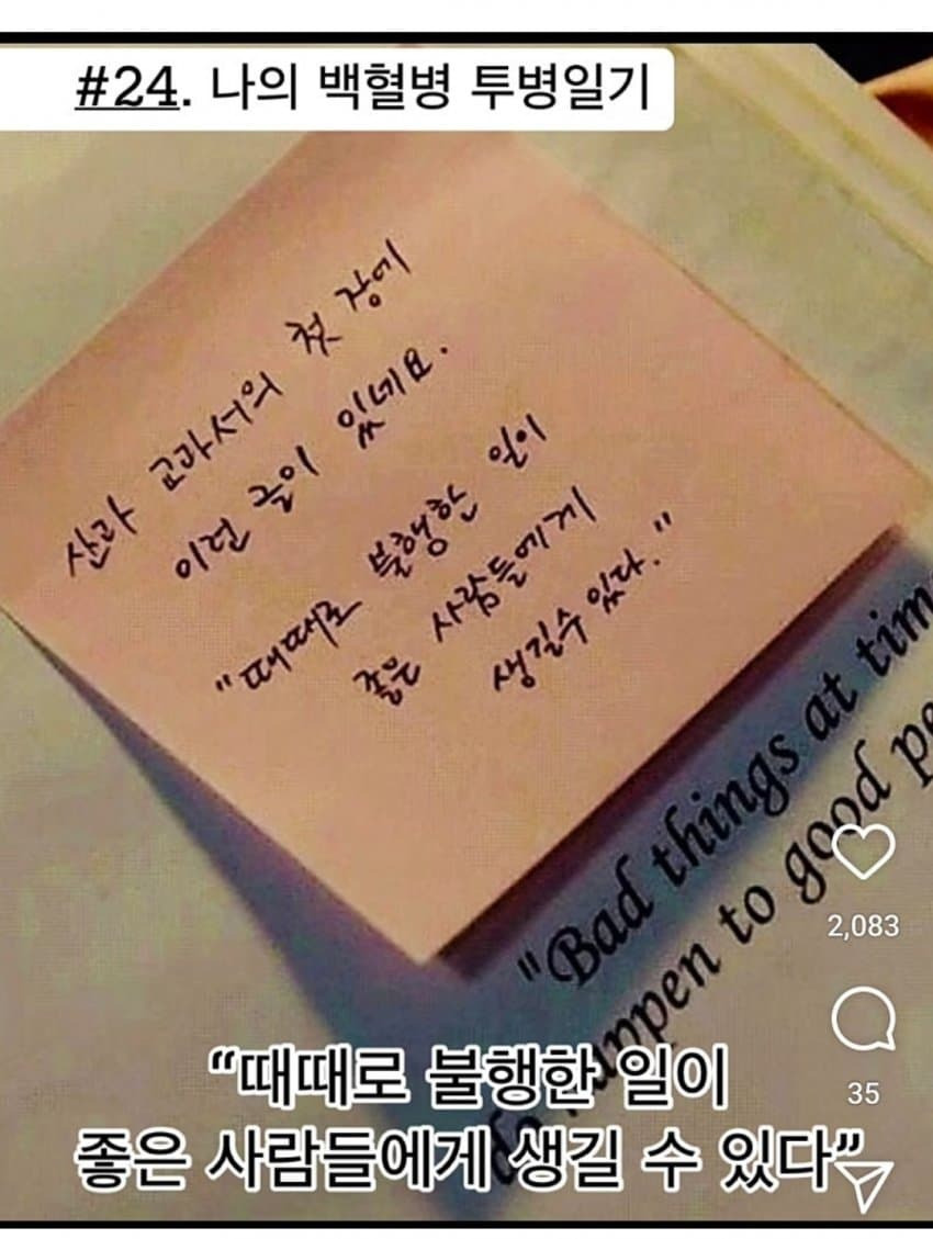 이 모든 이야기는 우리에게 경각심을 일깨우는 동시에, 암의 원인에 대한 불확실한 진실을 던져준다. 과연 우리는 무엇을 믿고, 어떤 기준으로 자신을 지켜야 할까? 이 환자의 백혈병 투병일기는 단순한 개인의 이야기가 아닌, 암 투병 환자들이 공동으로 겪는 무거운 현실의 일면을 드러내고 있다.