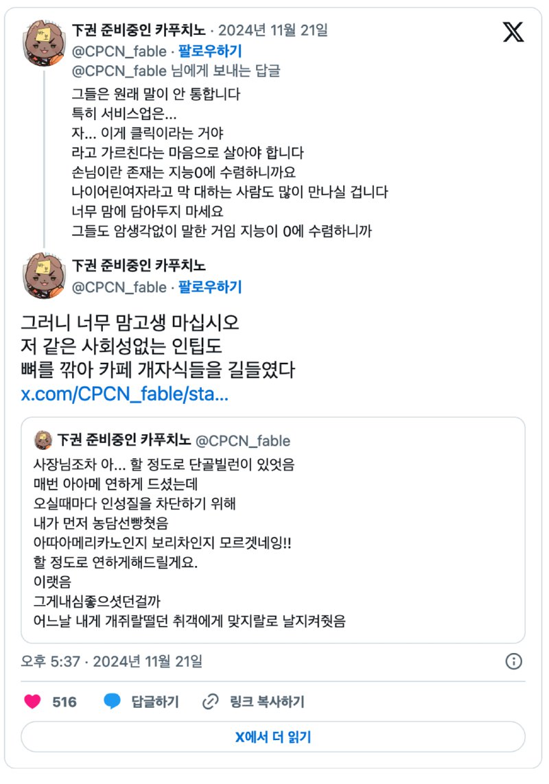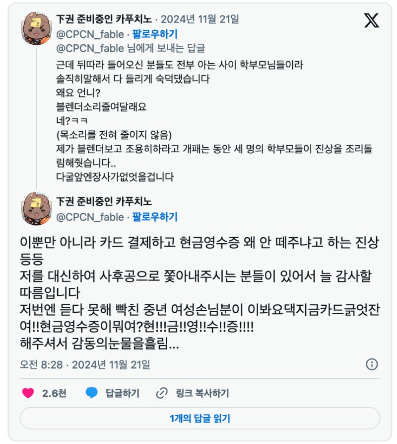해당 카페는 동네카페로 유명한 곳이며, 단골손님들 사이에서는 익숙한 장소인데, 그 동안의 특별한 에피소드는 아닌 상황입니다. 직원은 자신의 반응으로 손님들로부터 지지를 받았고, 특히 그 자리에 있던 세 명의 학부모 손님들은 이 사태를 지켜보며 진정을 시켰던 것으로 알려졌습니다. 이들은 직원의 편을 들며 상황을 함께 웃어넘겼고, 결국 손님의 황당한 요청은 기억에 남는 화제거리로 만들었습니다.