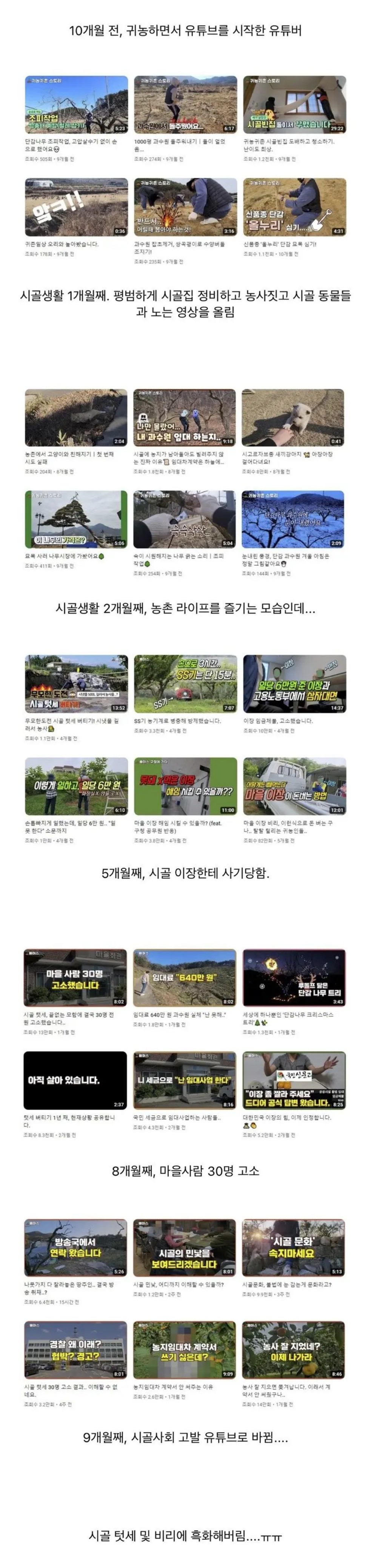 10개월 전, 한 유튜버가 귀농을 선언하며 새로운 삶에 도전했다. 그의 유튜브 채널은 귀농의 모든 것, 즉 시골 생활과 농사짓기를 기록하기 시작했다. 그는 시골 빈집을 꾸미고, 과수원에서 일하며 농작물을 키우는 모습을 찍어 올렸다. 그러나 시간이 지나면서 그의 잔잔한 귀농 스토리는 믿을 수 없는 반전으로 가득 차기 시작했다.