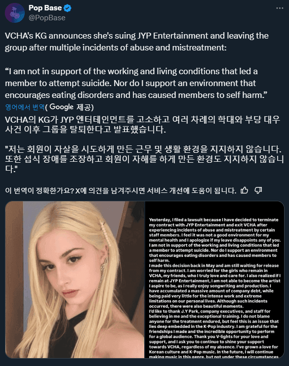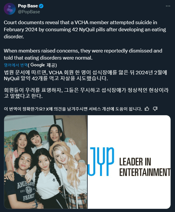 2024년 2월, VCHA의 한 회원이 섭식장애로 고통받던 중 극단적인 선택을 시도하며 42개의 NyQuil 알약을 복용하는 사건이 발생했습니다. 법원 문서에 따르면, 이 끔찍한 사건은 회원들이 걱정스러운 마음을 표현했을 때에도 JYP 엔터테인먼트 측에 의해 무시되었다고 합니다. 그들은 이런 섭식장애가 일반적인 현상이라며 회원들의 고통을 간과한 것으로 보입니다.