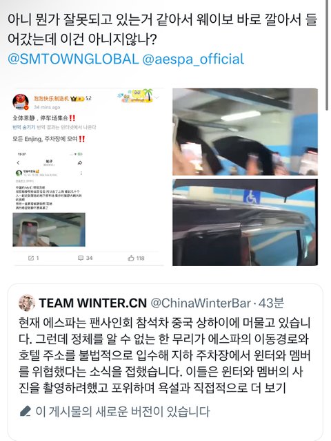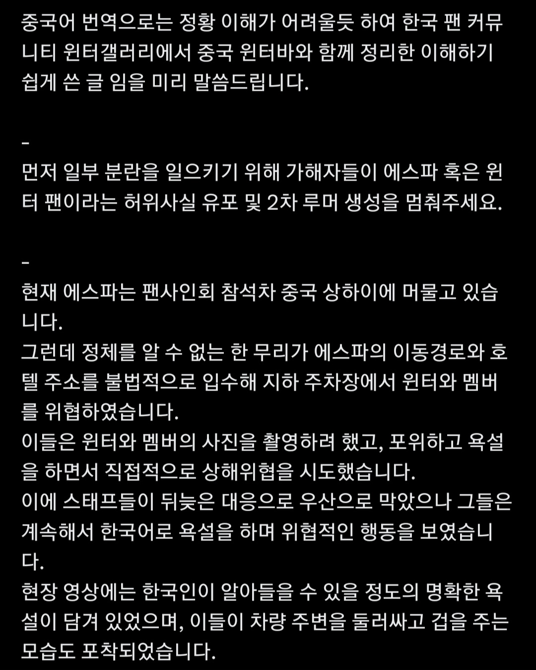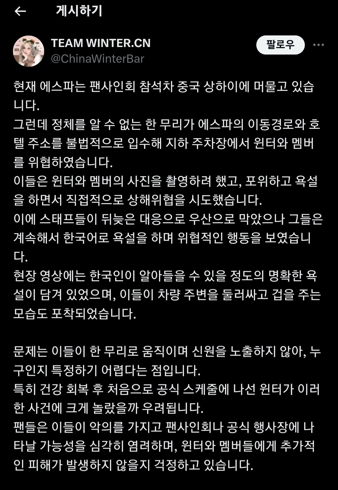에스파가 팬사인회를 위해 상하이에 도착한 가운데, 충격적인 사건이 발생했습니다! 정체불명의 무리들이 에스파의 이동경로와 숙소 정보를 불법적으로 입수해, 윈터와 멤버들을 위협하는 상황이 벌어진 것입니다. 이들은 지하 주차장에서 멤버들을 포위하고, 카메라를 들어 사진을 찍으려 하며 폭언을 퍼붓고, 직접적인 신체적 위협을 감행했습니다.
