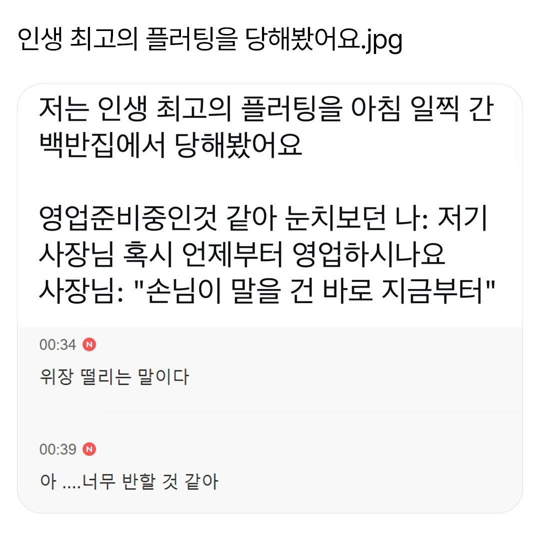 아침 일찍 한 백반집에서 벌어진 놀라운 플러팅 사건이 세간의 이목을 끌고 있다! 블로그에 따르면, 주인공은 가게가 영업 준비 중인 듯한 분위기 속에서 한껏 긴장한 모습으로 사장님에게 질문을 던졌다. 그때 사장님이 전한 대답은 바로 “손님이 말을 건 바로 지금부터”라는 충격적인 한마디였다!