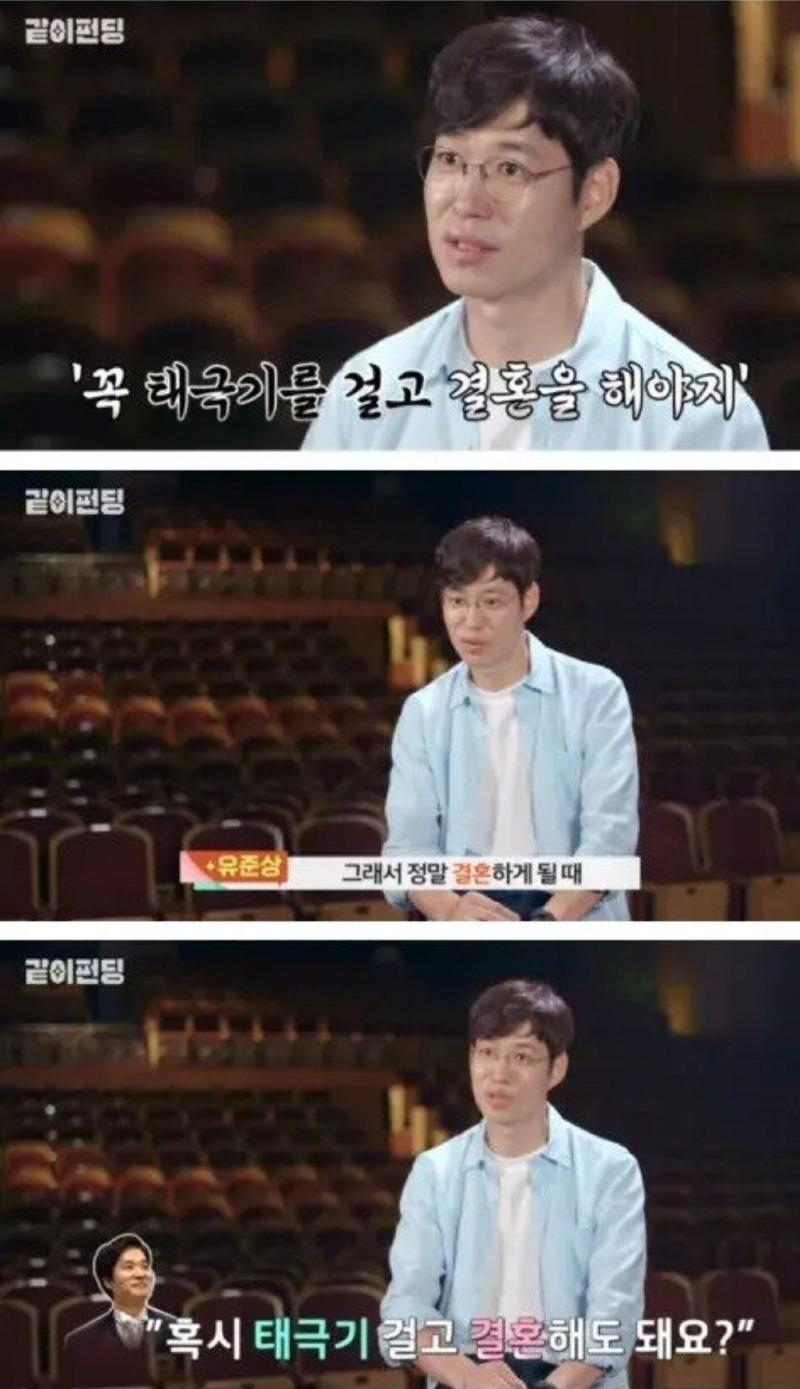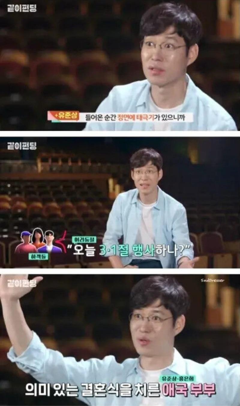 결혼식 날, 대형 태극기가 하객들을 맞이하자, 하객들은 "오늘 3.1절 행사인가?"라며 어리둥절한 반응을 보였습니다. 유준상은 "결혼하는 김에, 임시정부로 신혼여행을 가자!"고 제안하며, 대담하지만 의미 있는 선택을 하였습니다. 그의 아내는 이런 제안에 대해 흔쾌히 동의하며, 애국적인 마음을 함께 나누었습니다.