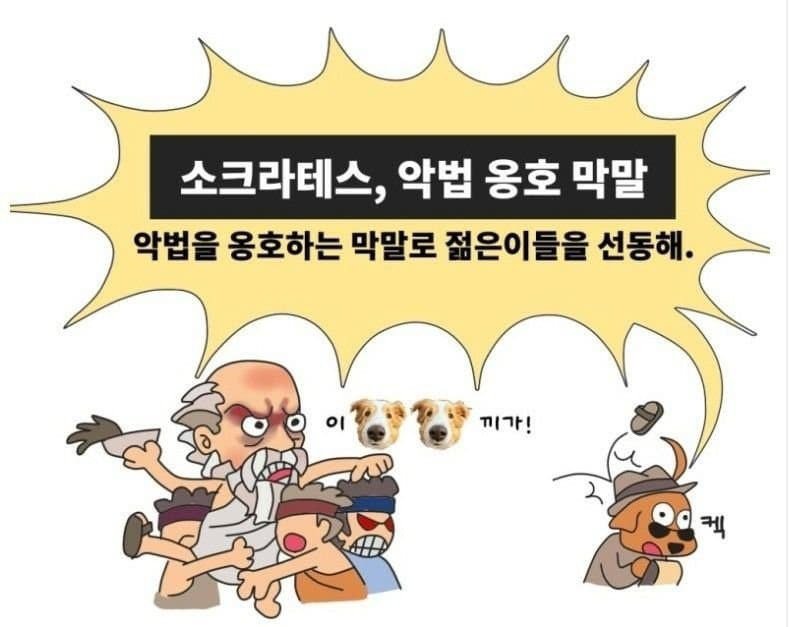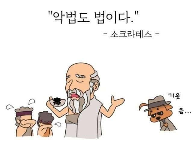 소크라테스 역시 악법을 옹호하는 발언으로 젊은이들을 선동하고 있는데, “악법도 법이다”라는 막말로 논란을 일으켰습니다. 이런 소식에 혹자는 “기웃기웃”이라고 비꼬며 그를 조롱하는 모습을 보였습니다.