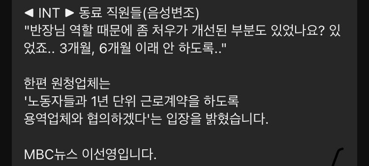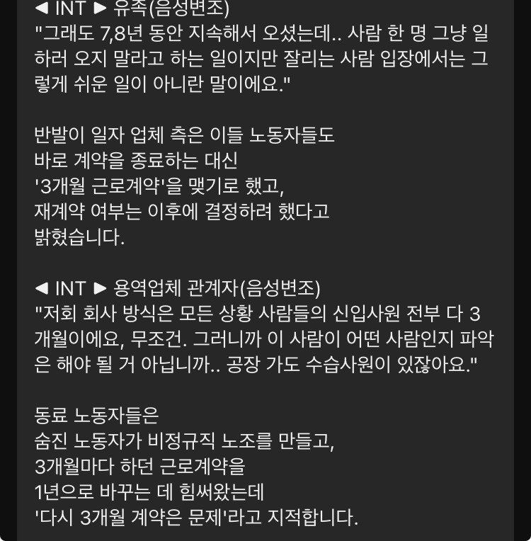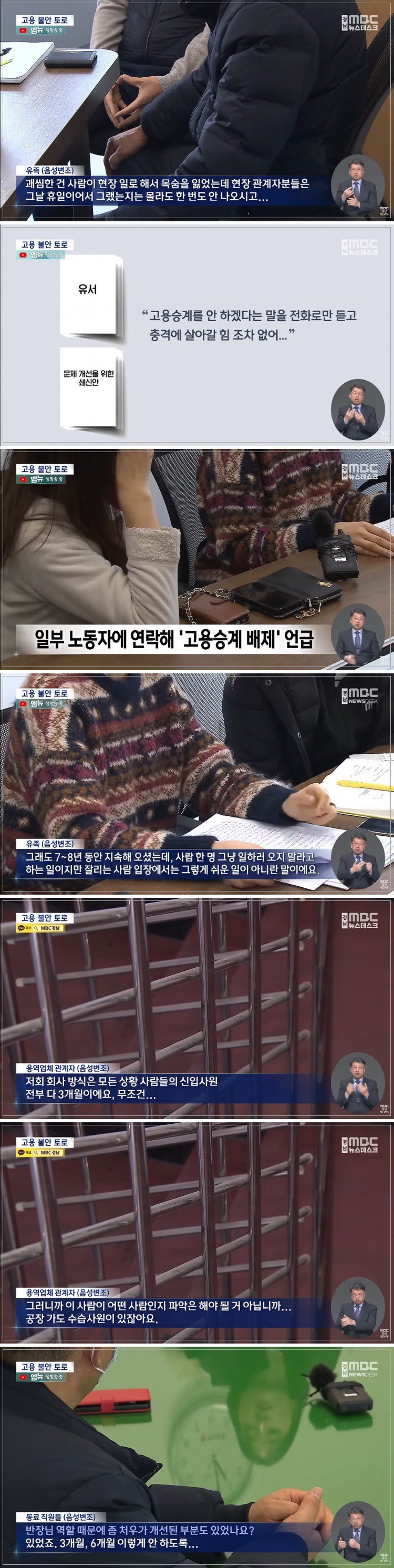 MBC 뉴스에 따르면, 이러한 고용 불안이 이들의 목숨을 앗아갈 수도 있다는 우려가 커지고 있다. 한 용역업체 관계자는 “모든 신입사원들은 무조건 3개월의 수습기간을 두고 있다"며 기존 노동자들의 상황을 제대로 파악하지 못하고 있는 현실을 드러냈다.