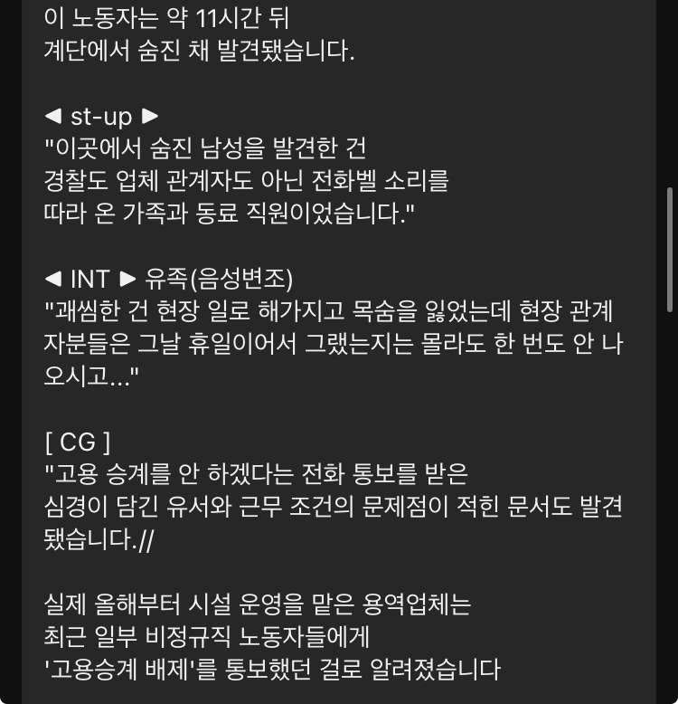 최근 충격적인 사건이 발생했다. 해고 통보를 받은 경비 노동자가 숨진 채 발견되면서, 그 배경이 주목받고 있다. 경비 노동자는 고용 불안 문제를 끊임없이 토로하며 생방송 중에도 그 심각성을 강조했다. 유족들은 음성 변조를 통해 "정말 괘씸한 것은 현장 관계자들이 그날 휴일이라며, 한 번도 현장에 모습을 드러내지 않았다는 것"이라며 분노를 표출했다.