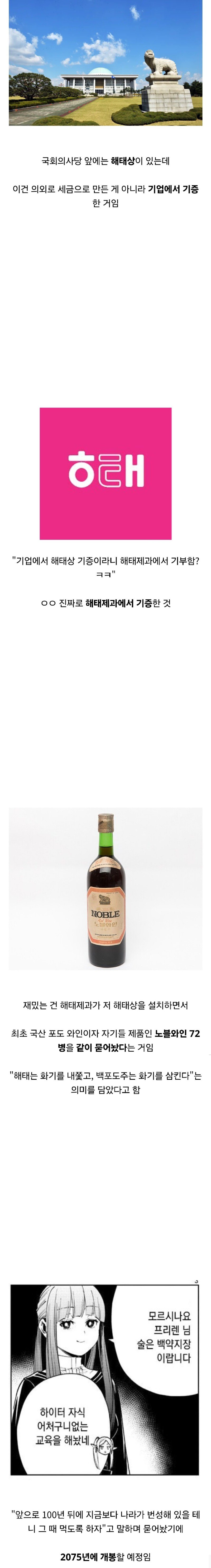 국회의사당 앞에 세워진 유명한 해태상이 사실은 세금이 아닌 의외로 기업의 기부로 만들어졌다는 충격적인 소식이 전해졌다! 해태제과가 이 해태상을 직접 기증했다는 사실, 모두가 깜짝 놀랐다는 후문이다. 그 유명한 노블와인, 바로 해태제과의 제품이라는 걸 아시나요? 이 상을 설치하면서 해태제과는 최초의 국산 포도 와인인 노블와인 72병을 함께 묻어놨다고 한다.