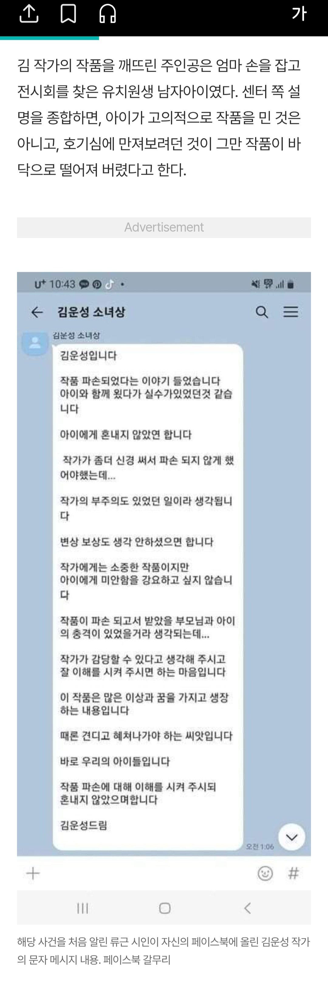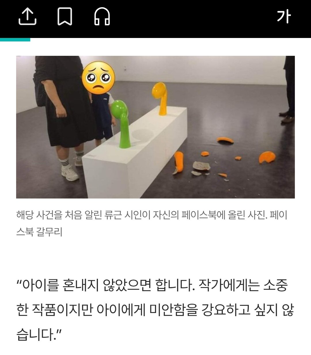 유치원생이 무시무시한 500만 원짜리 예술 작품을 산산조각 내고 말았다! 이 사건은 유명 시인 류근이 자신의 페이스북에 올린 사진으로 세상에 알려졌다. 류 시인은 “아이를 혼내지 않았으면 합니다. 작가에게는 소중한 작품이지만 아이에게 미안함을 강요하고 싶지 않습니다”라고 말하며 사건의 진실을 알렸다.