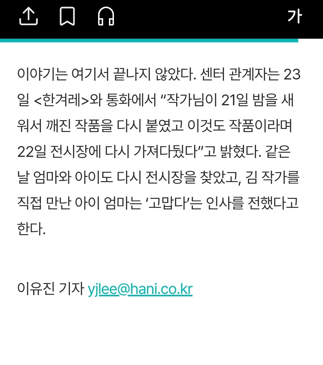 김 작가는 이 사건에 대해 “작가가 좀 더 신경 써서 파손되지 않게 했어야 했다”며, 자신의 작품이 무참히 망가진 것에 대한 불만도 내비쳤다. 그러나 그는 결코 보상이나 변상을 요구하지 않았고, 오히려 “작품이 파손되고서 받은 부모님과 아이의 충격이 클 것”이라며 아이에게 너무 큰 부담을 주고 싶지 않다는 선의의 마음을 표현했다.