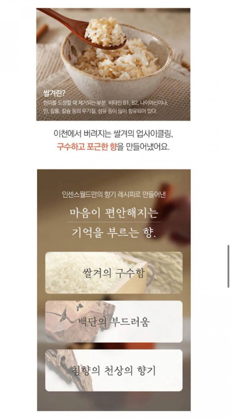 여기서 쌀겨란 무엇인가? 바로 현미 도정 시 제거되는 부분으로, 비타민 B1과 B2는 물론, 다양한 미네랄과 섬유가 풍부하게 포함되어 있다. 이천에서는 버려지는 쌀겨를 업사이클링하여 구수하고 포근한 향으로 탈바꿈한 것이다! 인센스월드는 이 독창적인 향을 발명하는 데에 심혈을 기울였으며, 마음을 편안하게 할 수 있는 기억을 불러일으키는 향을 선보였다.
