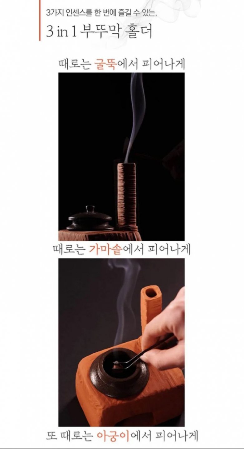 이 제품은 쌀겨의 구수함, 백단의 부드러움, 그리고 침향의 천상의 향기를 한번에 경험할 수 있는 3in1 부뚜막 홀더를 포함하고 있다! 또한, 인센스가 피어나는 장소를 선택할 수 있어 굴뚝, 가마솥, 심지어 아궁이에서도 사용할 수 있는 다재다능함이 특징이다.