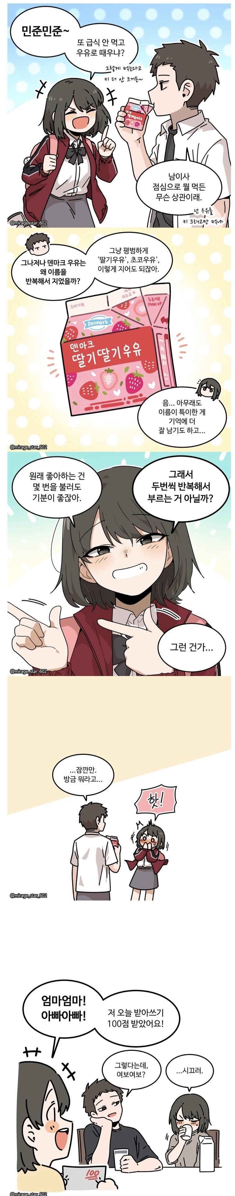 딸기딸기우유, 그 미스터리의 실체가 밝혀졌다! 다들 민준이처럼 급식 대신 우유만 마시는 현상을 목격했구나! 덴마크 우유가 왜 이름을 두 번이나 반복했는지 궁금하지? 사실 그렇게 먹는다고 해서 키가 더 크지는 않는다는데, 한편으로는 덴마크 우유의 독특한 이름이 사람들의 기억에 남기 위한 전략인지 모르겠다.