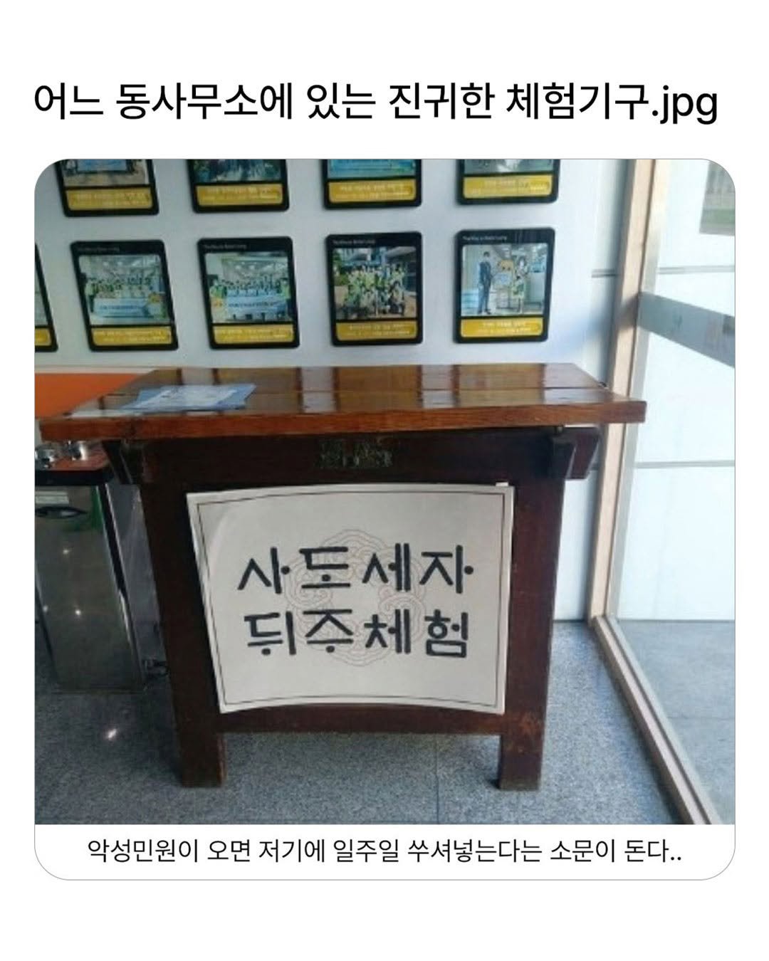 어느 동사무소에서 발견된 기상천외한 체험기구가 화제를 모으고 있다. 이 기구는 사도세자와 관련된 이색적인 '뒤주 체험'을 제공한다고 전해지는데, 여기에 대한 소문이 마치 전설처럼 퍼지고 있다. 이를 통해 '악성민원'이 쏟아질 경우, 해당 기구에 일주일간 쑤셔넣는다는 충격적인 소식이 알려졌다.