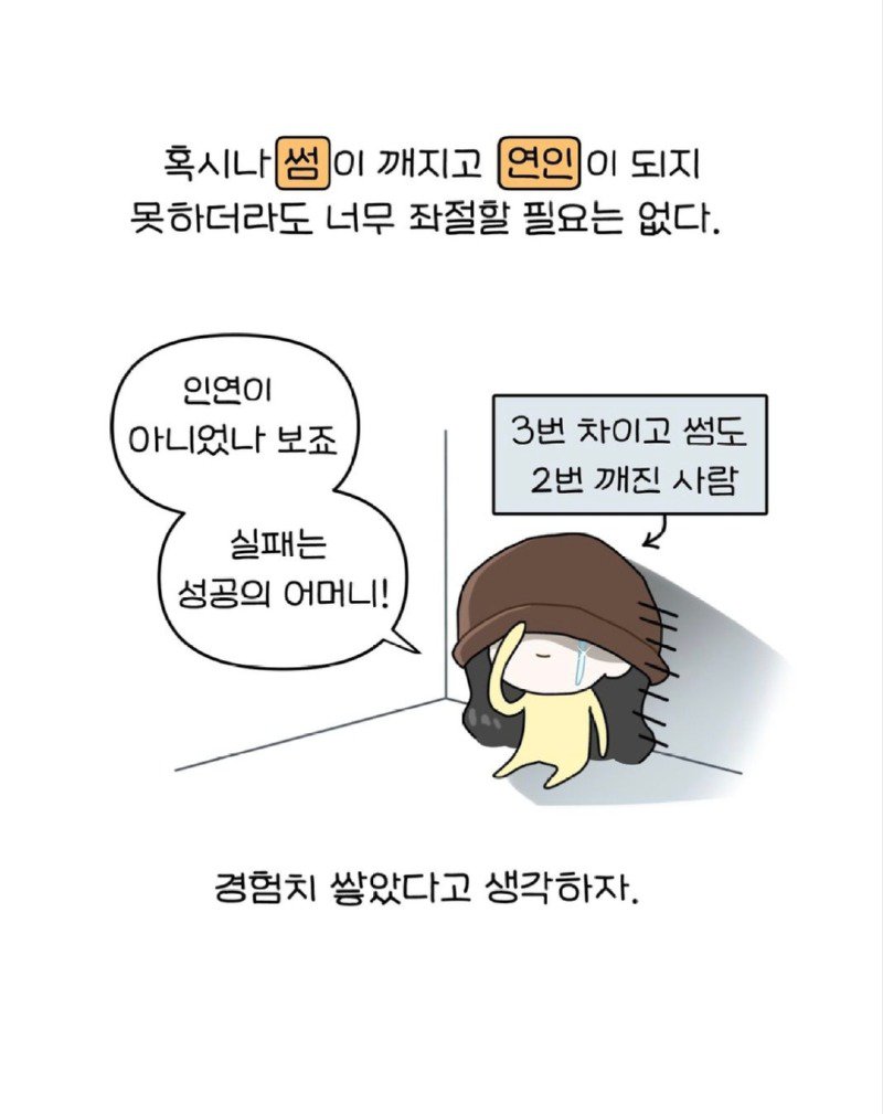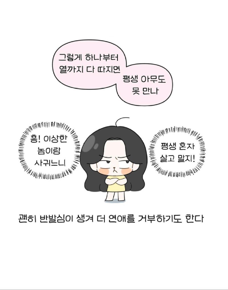 그러니 결국 "사귀어달라"는 마음은 사라지고, 괜찮지 않은 사람과의 연애를 고민하게 되는 역설적인 상황에 놓이게 된다. 알고보니 범죄자일까 걱정하며, 요즘 세상이 얼마나 흉흉한데 사귀면서 알아가야 하나 싶기도 하다! 이렇게 내향인의 연애는 미로에 빠져들고, 과연 모솔 탈출은 언제 이루어질런지…